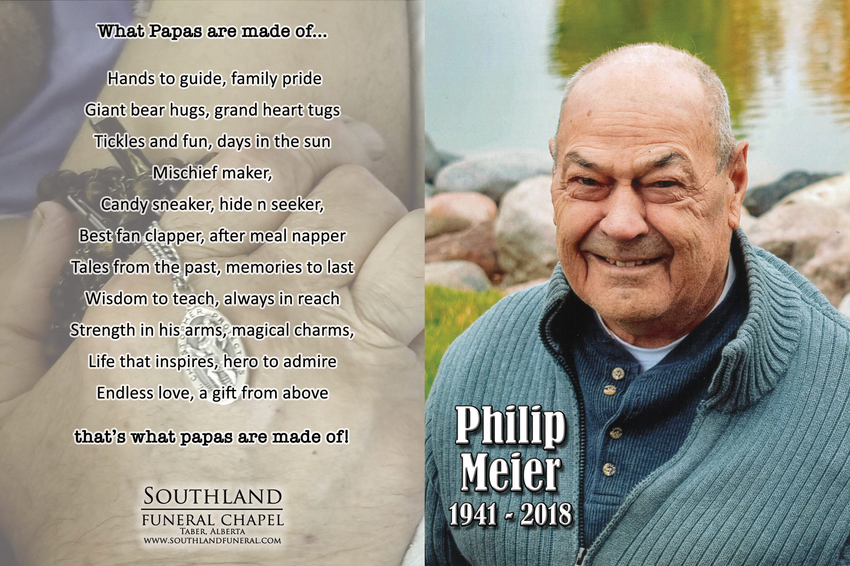 Besides his loving wife Janet, Philip is survived by their children Phyllis (Gord) Loewen of Vauxhall, Joyce (Tim) Gow of Vauxhall, Tom (Kerri) Meier of Calgary and Rebecca (David) Johnson of Edmonton; eleven grandchildren and six great grandchildren. He is also survived by his siblings Frank Meier, Caroline (Phillip) Bosh and John Meier; sister-in-law Shirley Meier and by numerous nieces and nephews.