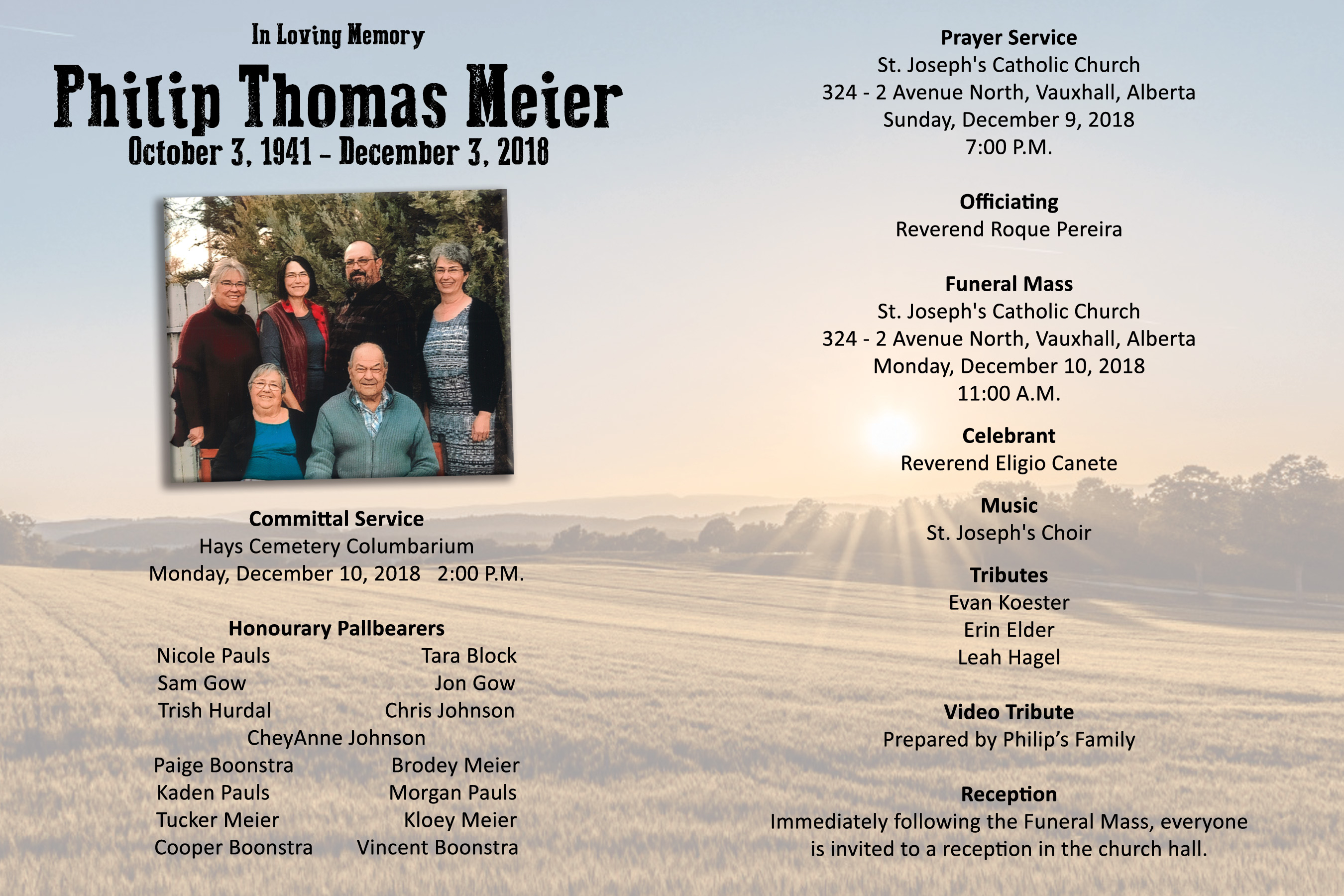 The Funeral Mass was celebrated at St. Joseph's Catholic Church, 324 - 2 Avenue North, Vauxhall on Monday, December 10, 2018 at 11:00 A.M. A committal service followed at the Hays Cemetery.