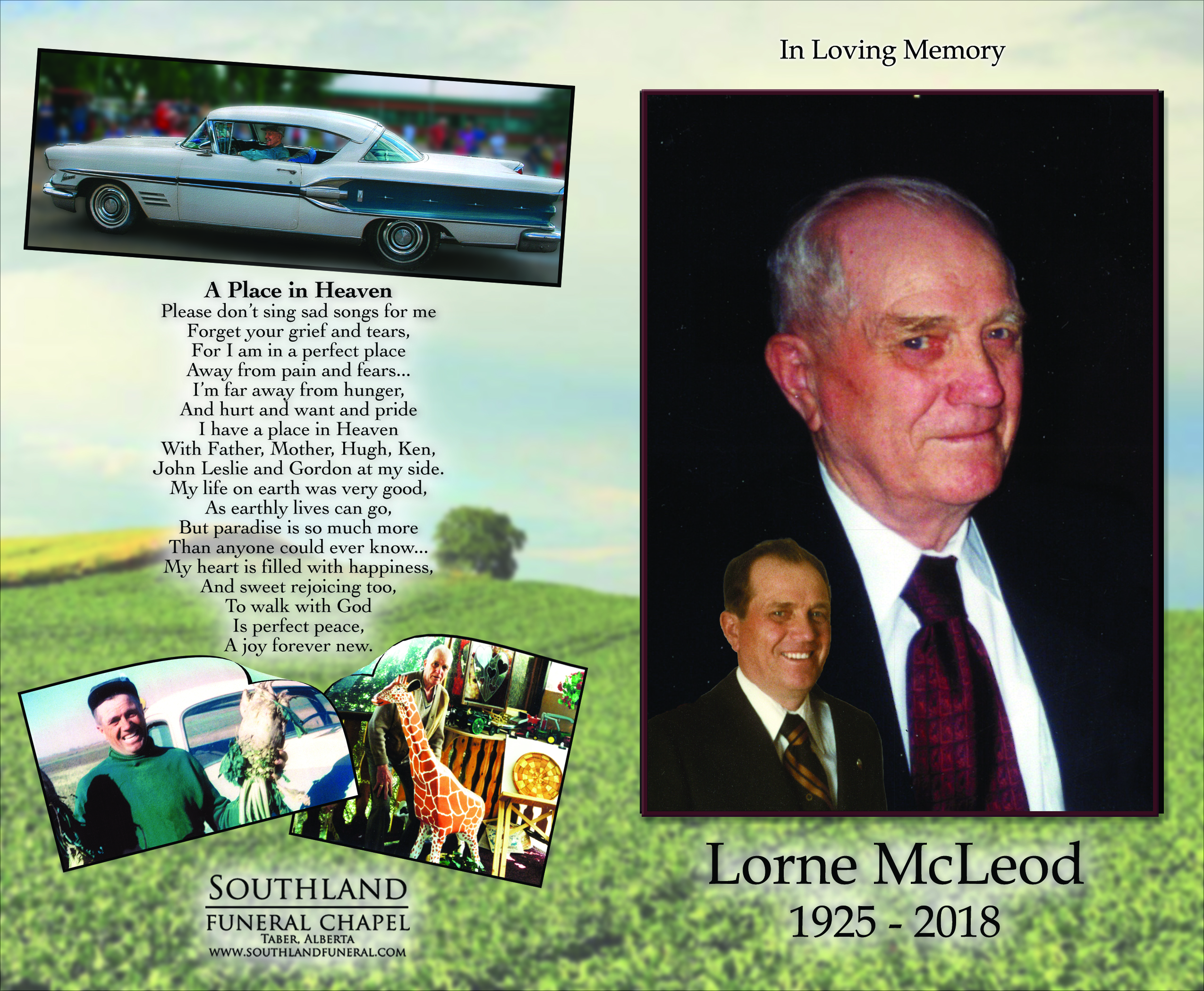 Lorne is survived by his loving wife Blanche and their children Gary (Marilyn) McLeod of Calgary, Terry (Brendan) Woodman of Salt Springs Island, British Columbia and Brenda (George) Wright of Cardston. He is also survived by his younger brother Don (Joan) McLeod of Southey, Saskatchewan.