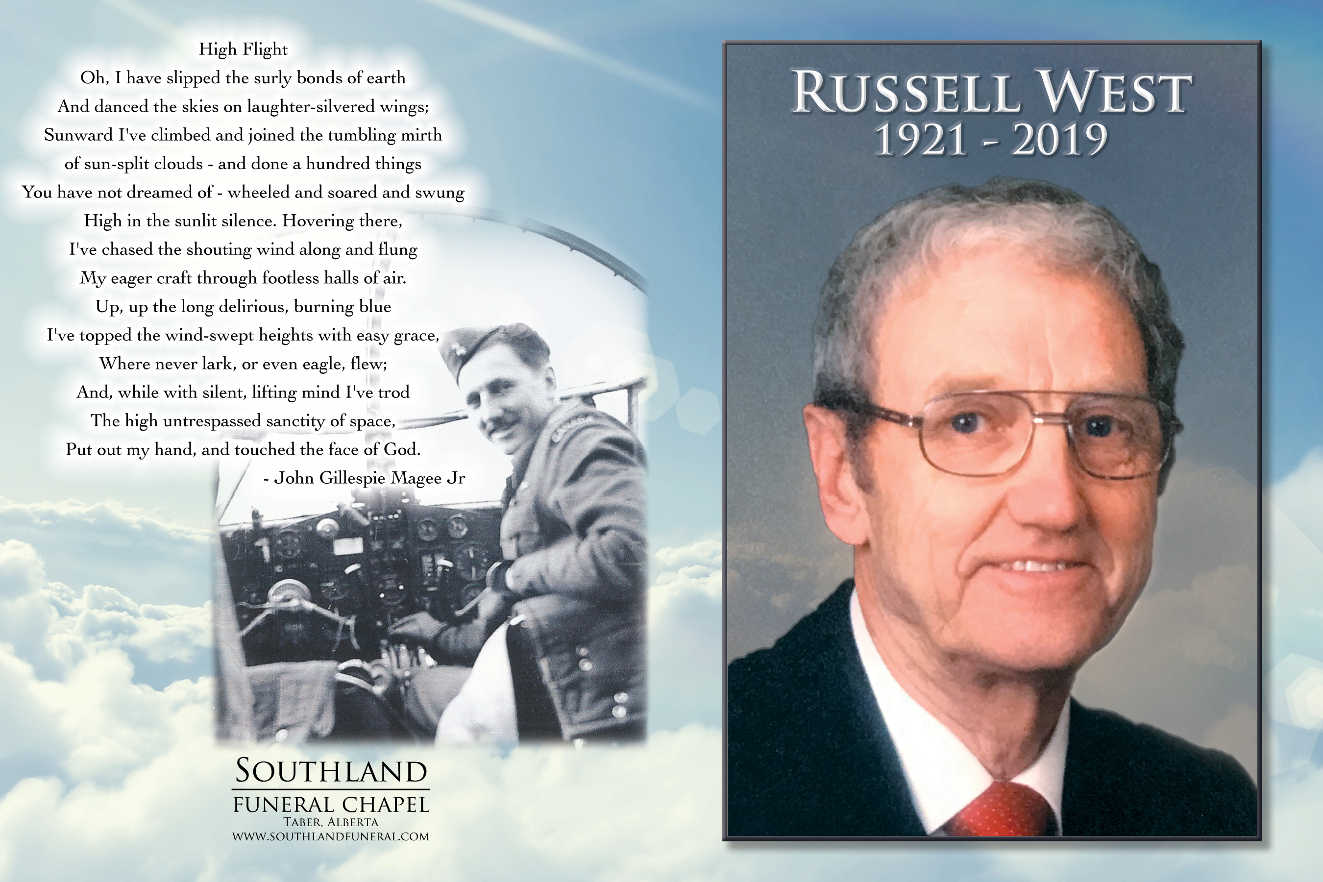 Flowers are gratefully declined. If friends so desire, memorial tributes in memory of Russell may be made directly to the Royal Canadian Legion - Branch No. 20, 5205 - 48 Avenue, Taber, Alberta T1G 1S8 or to The Good Samaritan Society, Linden View, 4700 - 64 Avenue, Taber, Alberta T1G 0C6.