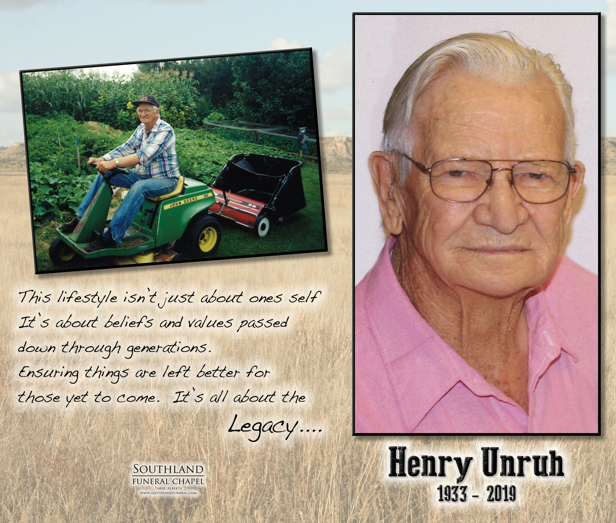 Henry Dave Unruh of Enchant, beloved husband of Sue Unruh, passed away peacefully at the Chinook Regional Hospital on Wednesday, January 16, 2019 at the age of 85 years.