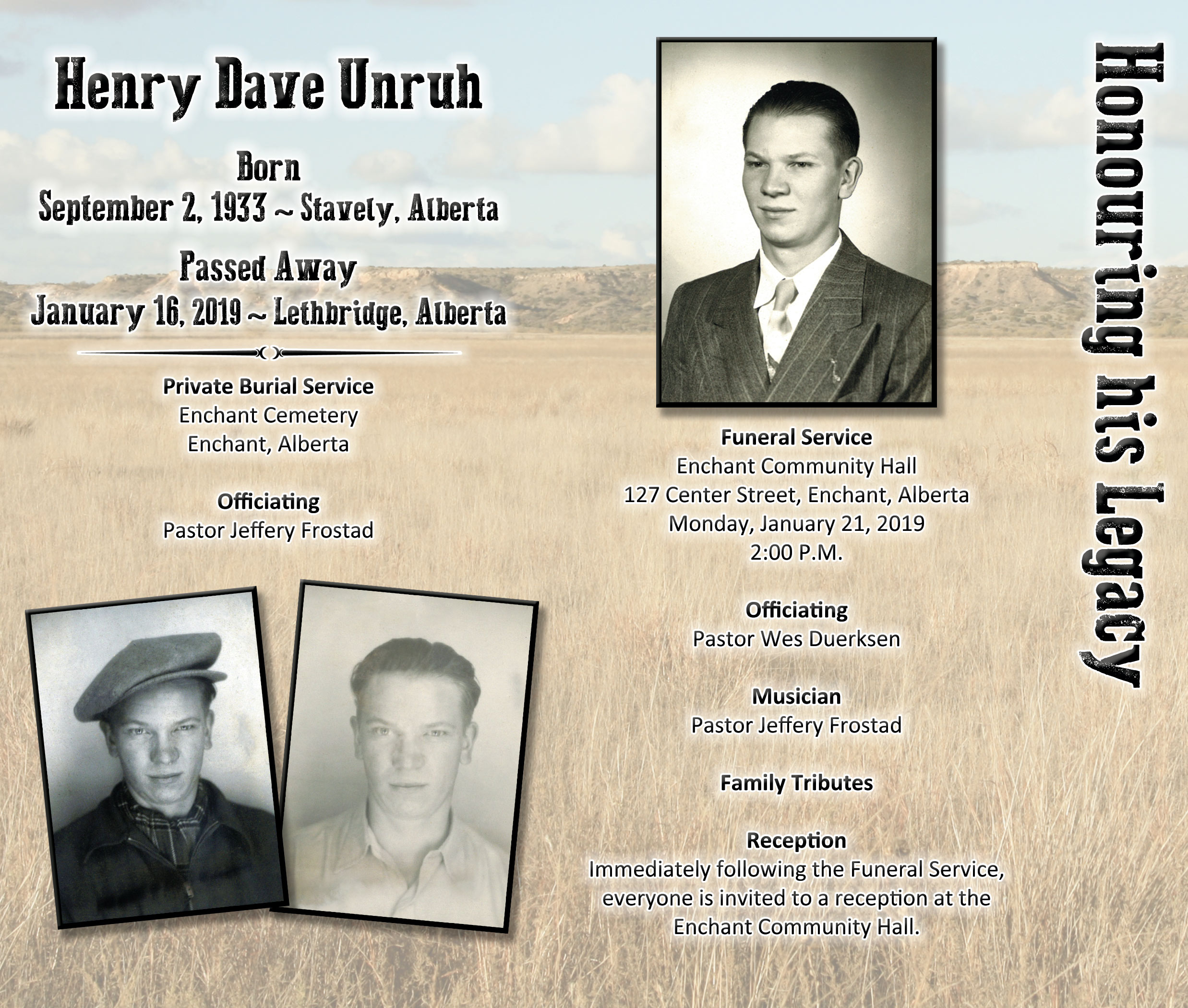 The Funeral Service was held at the Enchant Community Hall, 121 Center Street, Enchant on Monday, January 21, 2019 at 2:00 P.M.