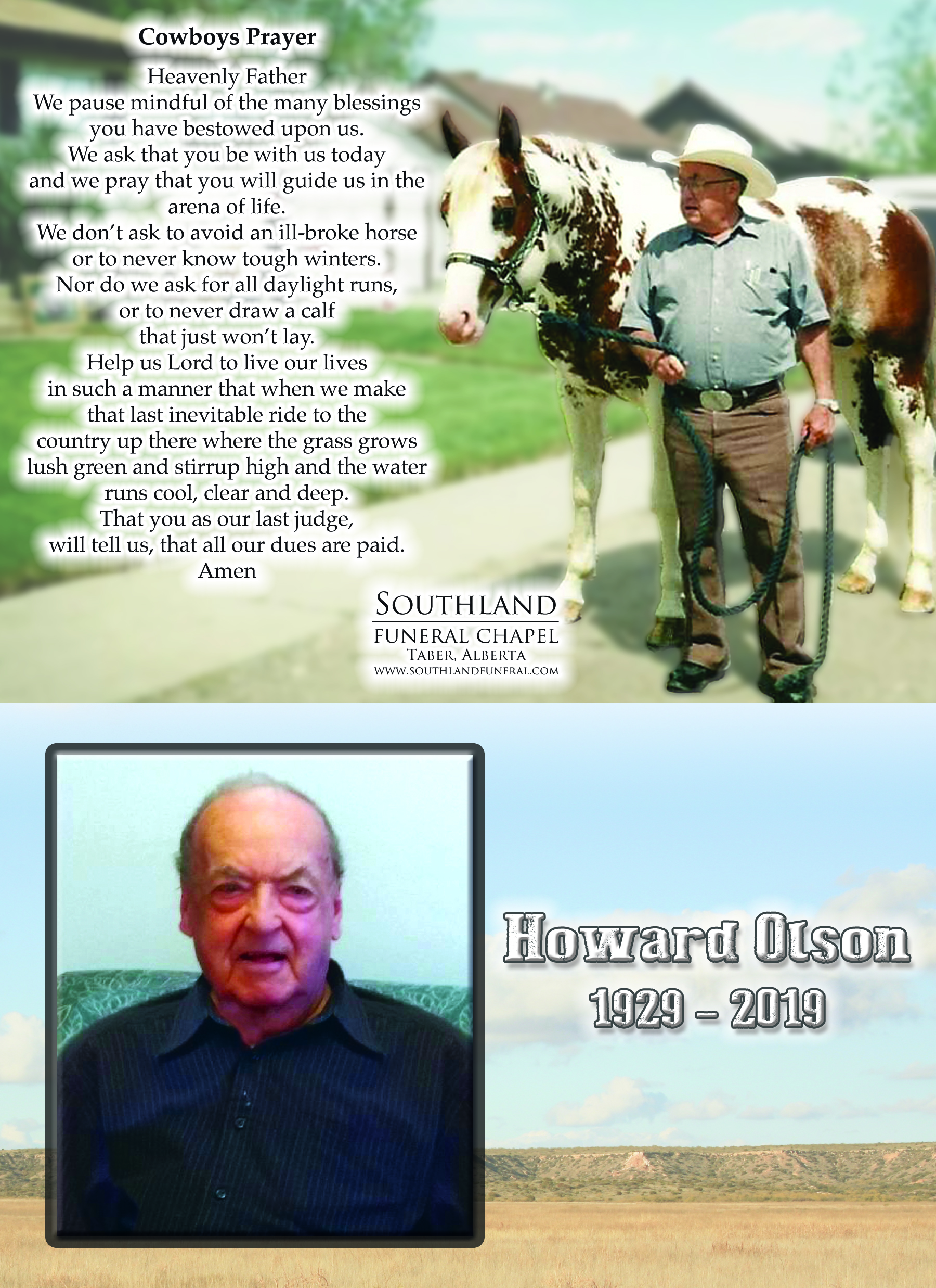 Besides his loving wife Jean, Howard is survived by his children Deborah Johnson of Didsbury, Bryce (Janet) Olson of Drayton Valley, Terry Olson of Calgary, Leslie Olson of Taber and Kenneth Olson (Tammy Taylor) of Ponoka as well as numerous grandchildren and great grandchildren. He is also survived by his sisters-in-law Lillian Olson and June Olson.