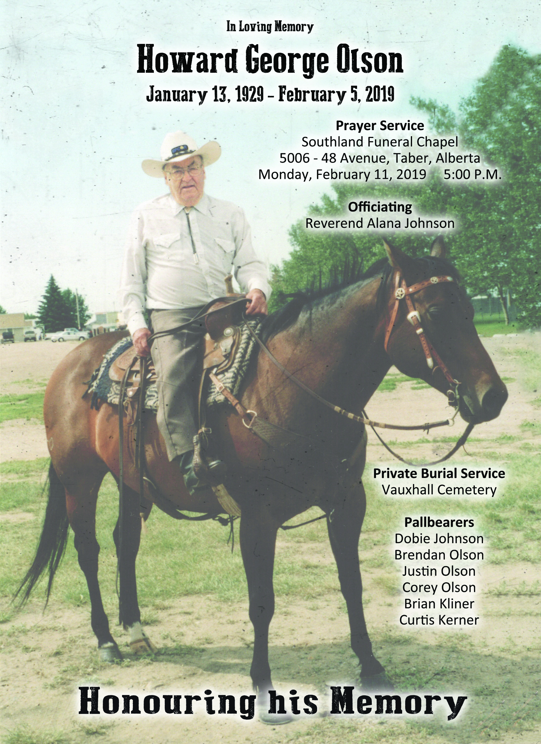 Howard was born on January 13, 1929 in Enchant to Ole and Nellie Olson. He married Jean Rombough in 1953 and together they raised their five children in Vauxhall. Howard was actively involved in the community as a school teacher, Mason, Saddle Club, Vauxhall Town Council, United Church and the Vauxhall Jets. He loved music and his horses which he shared with his daughter Leslie. He will be greatly missed.