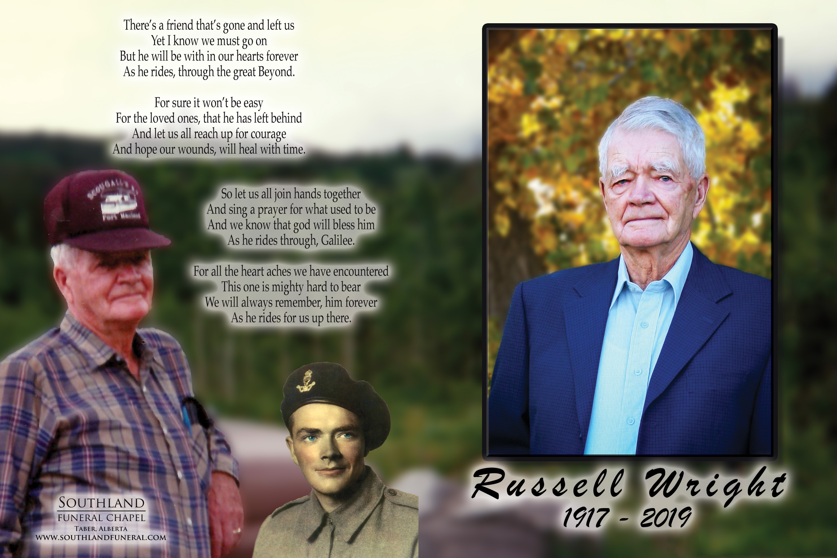 Russell was born to Roy and Mable Wright on March 12, 1917 in Eckville. At a young age, he and his family of ten siblings moved to Picture Butte and grew up on the family farm and he attended Granite Falls School. He later met Mildred Cyr and they were married on October 19, 1940. They worked on the Cohen Ranch in the Cowley/Lundbreck area until Russell volunteered to serve in World War II. Upon returning from the war, Russell and Mildred continued farming and raised their fourteen children. A few hard years forced them off the farm and an opportunity with the Prairie Farm Rehabilitation Administration (PFRA) moved the Wright family to Vauxhall where he worked as a carpenter, ditch rider and assistant water master in the Hays and Enchant areas until his retirement.