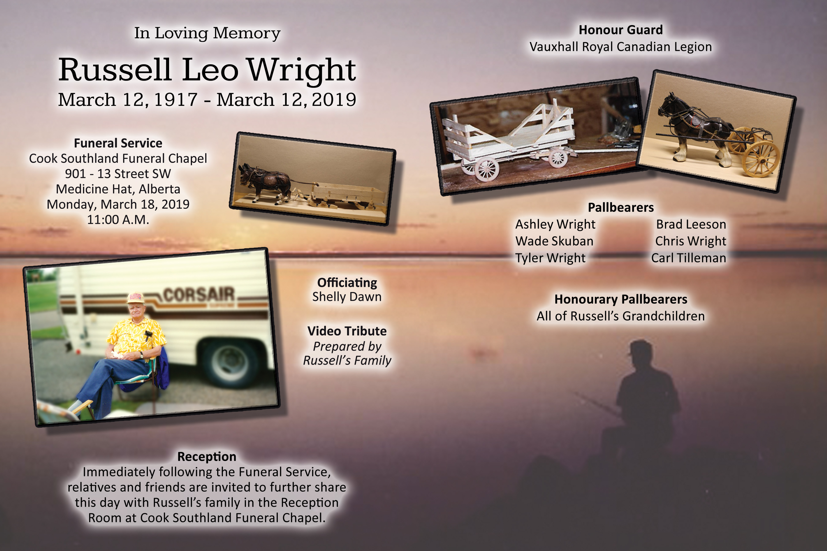 Russell is lovingly remembered by Mildred, his wife of seventy eight years and their thirteen children Russell (Alice) Wright of Hays, Gary Wright of Coaldale, Mable Leeson of Vauxhall, Doug (Lorette) Wright of Taber, Heather (Rodney) Skuban of Vauxhall, Gale (Robert) Connolly of Vulcan, Carmel Lewis of Milo, Richard Wright of Two Hills, Alan Wright of Medicine Hat, Pearl (Ian) Cully of Medicine Hat, Tim Wright of Taber, Barb (Lloyd) Tilleman of Lethbridge, Kelvin (Heather) Wright of Vauxhall and by numerous grandchildren, great grandchildren and great great grandchildren. He is also survived by his sister Dixie Alberts of Brooks. He will be fondly remembered by a large extended family.