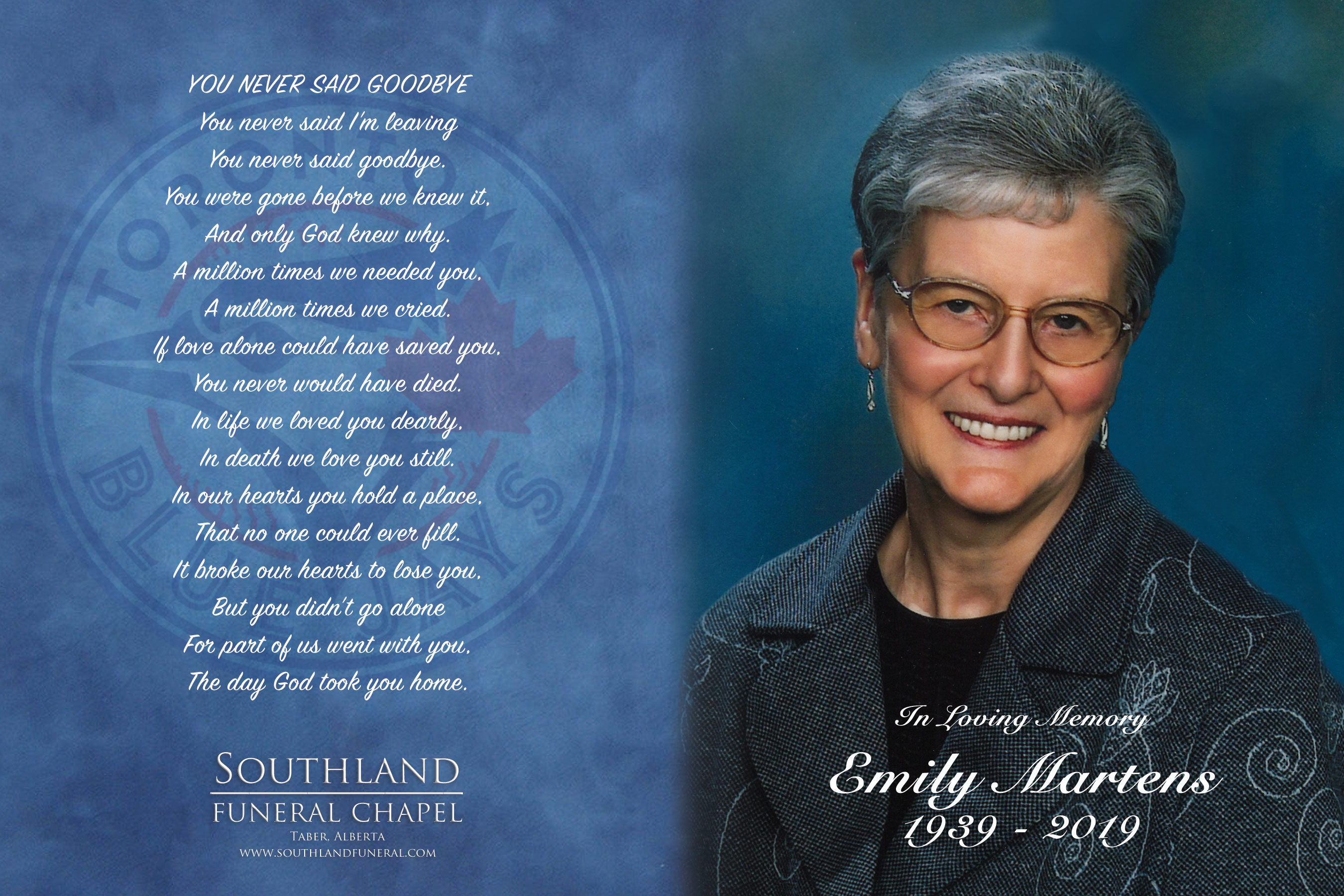 Emily is survived by four children Darlene (John) Wright of High River and their children Ryan (Farzana) Wright (daughter Prema) and Richelle Wright; Darrell (Carla) Martens of Coaldale and their children Chris (Jolene) Martens (daughter Brynn) and Kimberley (Marco) Slingerland (children Dustin, Shane and Tiffany); Dean Martens of Taber; Doug (Pam) Martens of Taber and their children Laurie (Brent) Untereiner (children Kaitlyn, Evan and Blake), Jennifer (Chris) Bruce (daughters Morgan and Kaylee), Amber (Luke) Langlands (children Tessa and Travis). She is also survived by her siblings Rose Beaman, Joan (Elio) Kain, Florence Martens, Bernie (Elsie) Elder and Bill (Monica) Elder: sisters-in-law Evelyn (George) Kopervas, Gloria Martens, Linda (Dennis) Biesel, Sophie Weiss, Michelle LeBlanc and Angela (Ken) Duke; brother-in-Law Ron Martens.