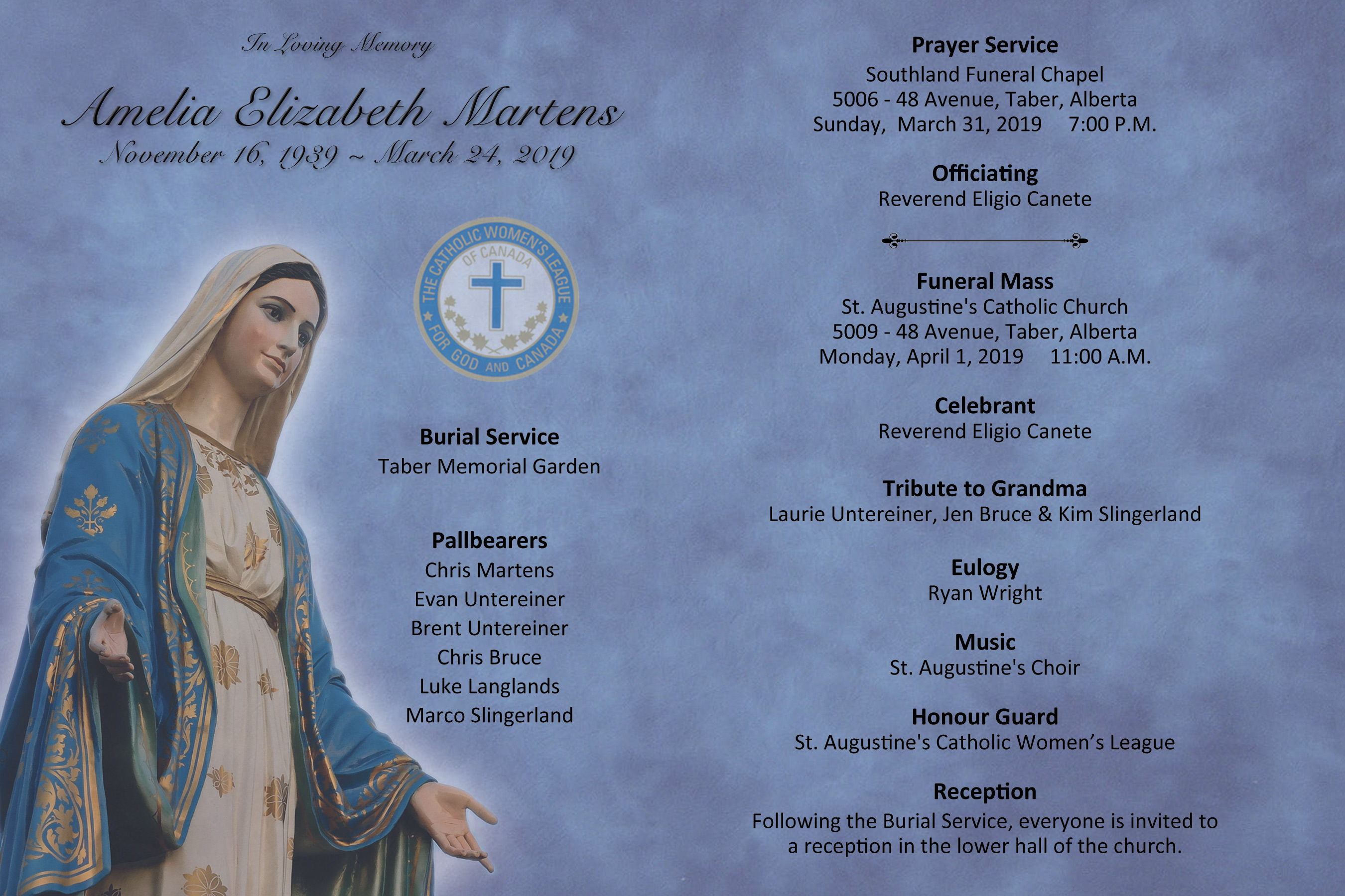 The Funeral Mass was celebrated at St. Augustine's Catholic Church, 5009 - 48 Avenue, Taber on Monday, April 1, 2019 at 11:00 A.M. Burial followed at the Taber Memorial Garden.