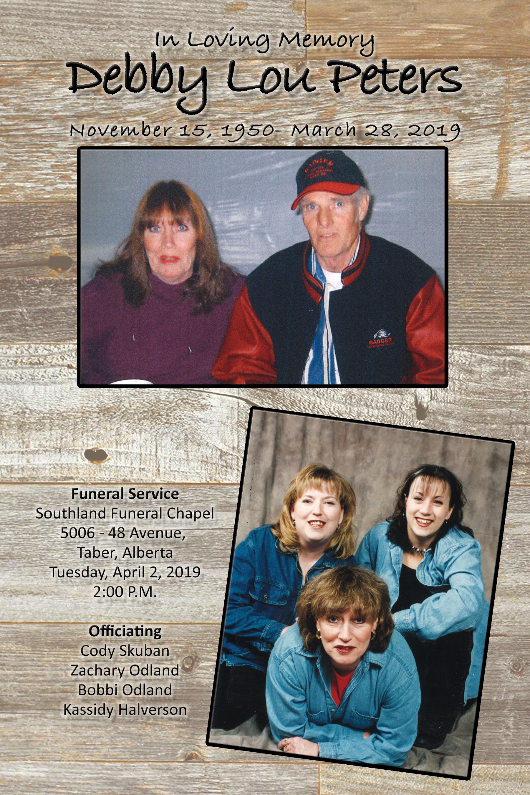 Debby Lou Peters, beloved wife of Bob Peters, passed away in Taber on Thursday, March 28, 2019 at the age of 68 years.