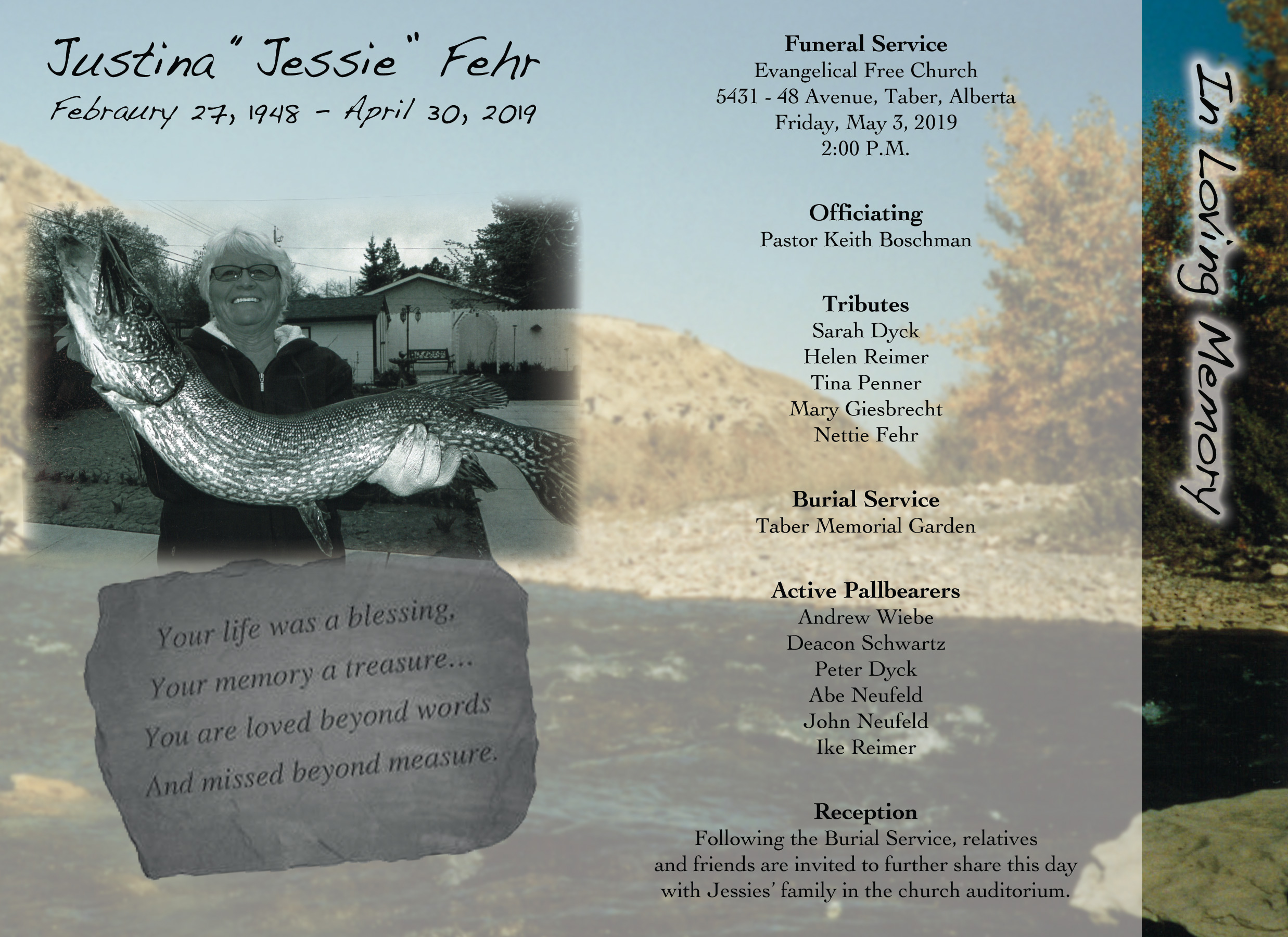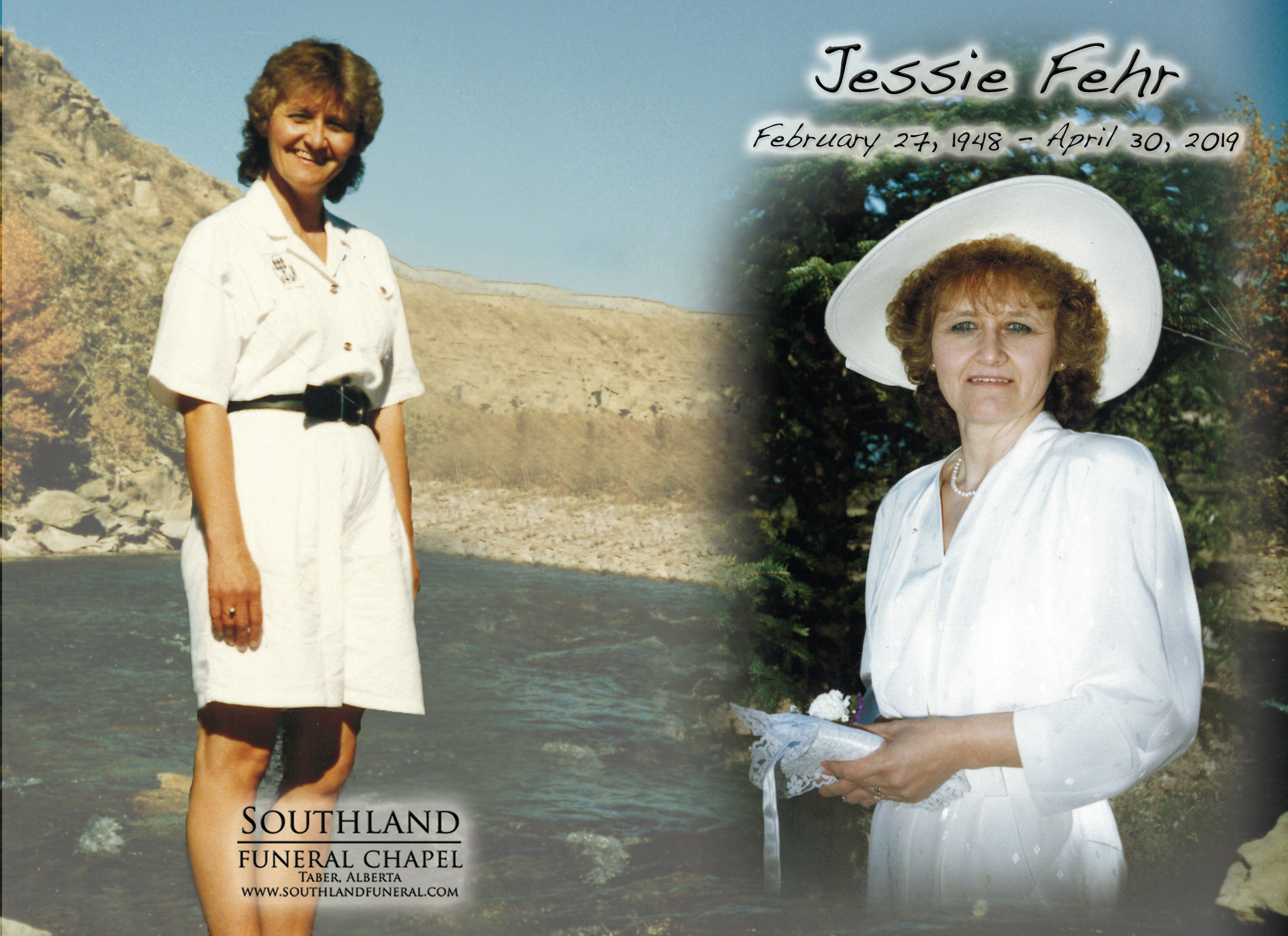 Jessie Fehr, born Justina Neufeld in Mexico on February 27, 1948 passed into the hands of Jesus at her home in Taber on Tuesday, April 30, 2019 at the age of 71 years.