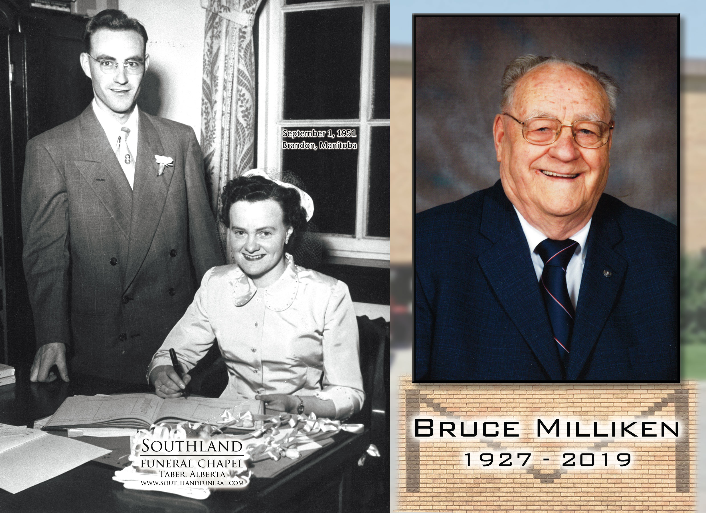 Bruce was born in Brandon, Manitoba on October 12, 1927, the youngest of four children, to Mary and George Milliken. He met his beloved Mary Reid at church and they were married in Brandon on September 1, 1951. In 1953, Bruce and Mary moved to Lethbridge and in 1957, made their permanent home in Taber. Over the next four decades, Bruce serviced the agricultural industry in southern Alberta, supplying innovative equipment and developing lifelong friendships in the farming community. Bruce was best known for operating Milliken Farm Supplies. He lived a life of service through Taber Town Council, the Taber Curling Club, the United Church of Canada, Kiwanis Club, University of Lethbridge Senate and the Lethbridge Community Foundation. He was a strong supporter of 4-H. He had a great love of music and sang in the Knox United Church choir for over fifty years. He enjoyed traveling, bird watching and stamp and coin collecting. He worked hard to provide a good life for his family. A long life, well lived.