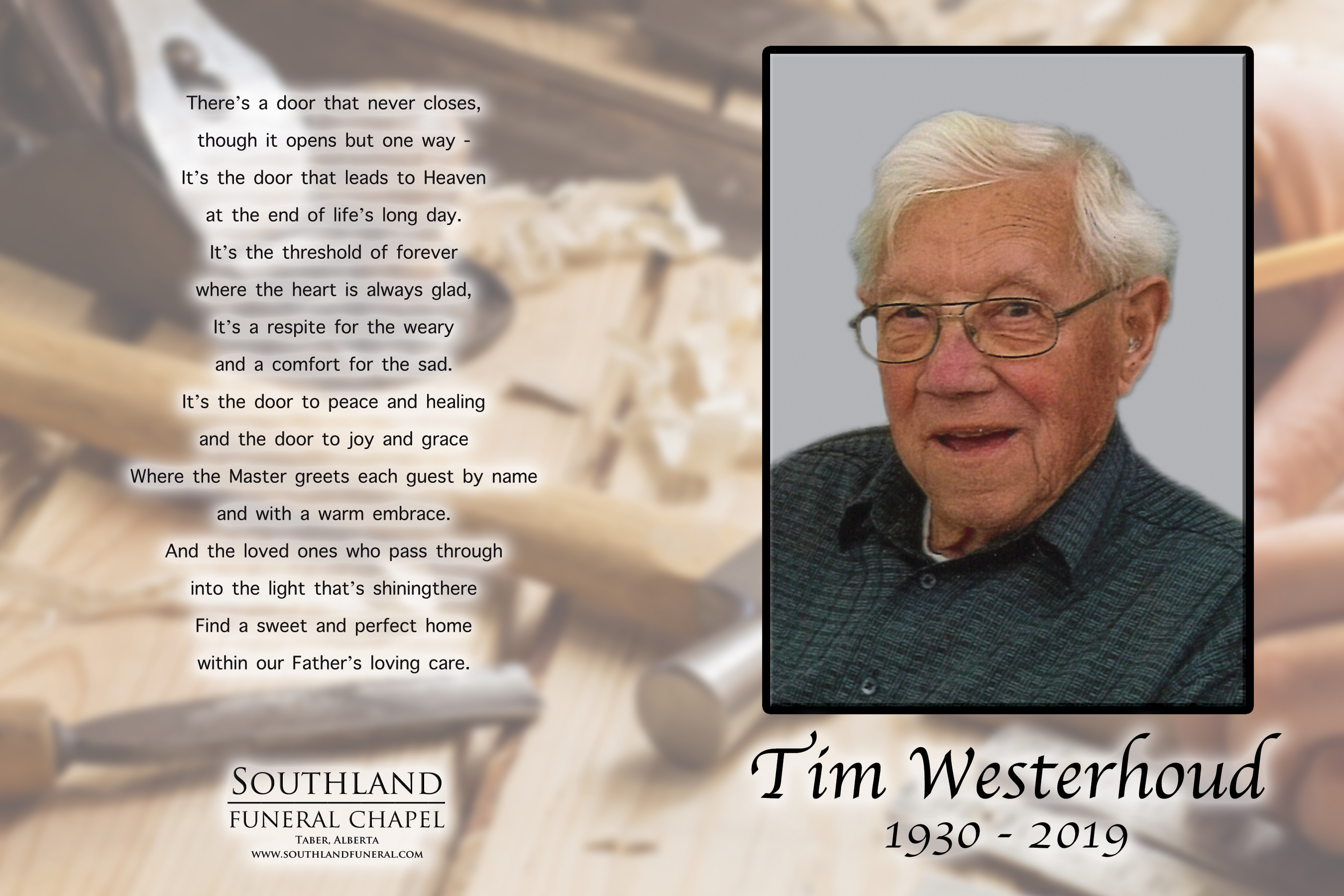 Entering into the glory of the Lord, Teunis “Tim” Westerhoud, beloved husband of the late Klaske “Clara” Westerhoud, passed away in Taber on Saturday, June 1, 2019 at the age of 89 years.
