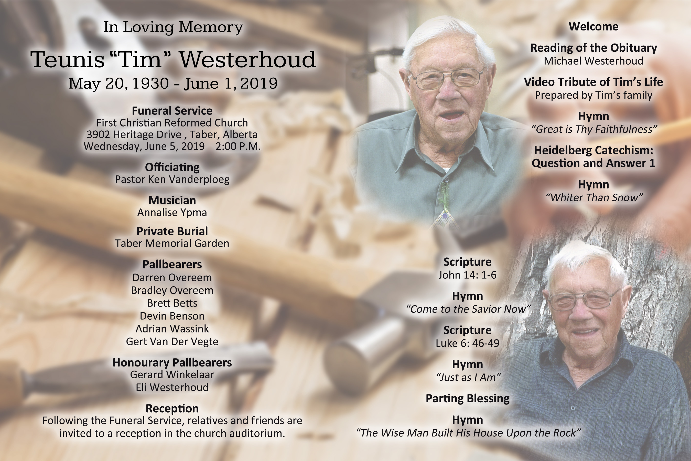 The Funeral Service was held at the First Christian Reformed Church, 3902 Heritage Drive, Taber on Wednesday, June 5, 2019 at 2:00 P.M.