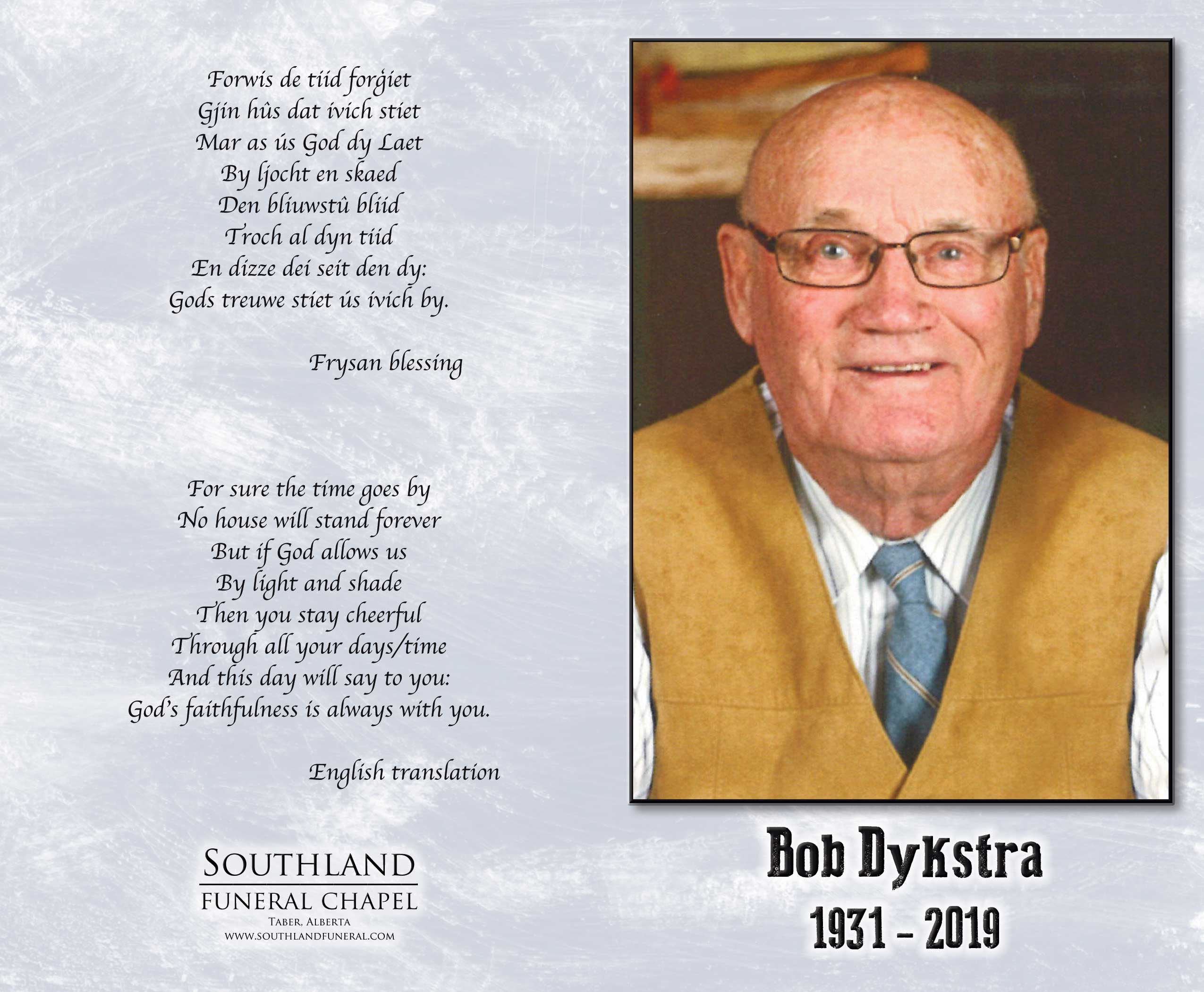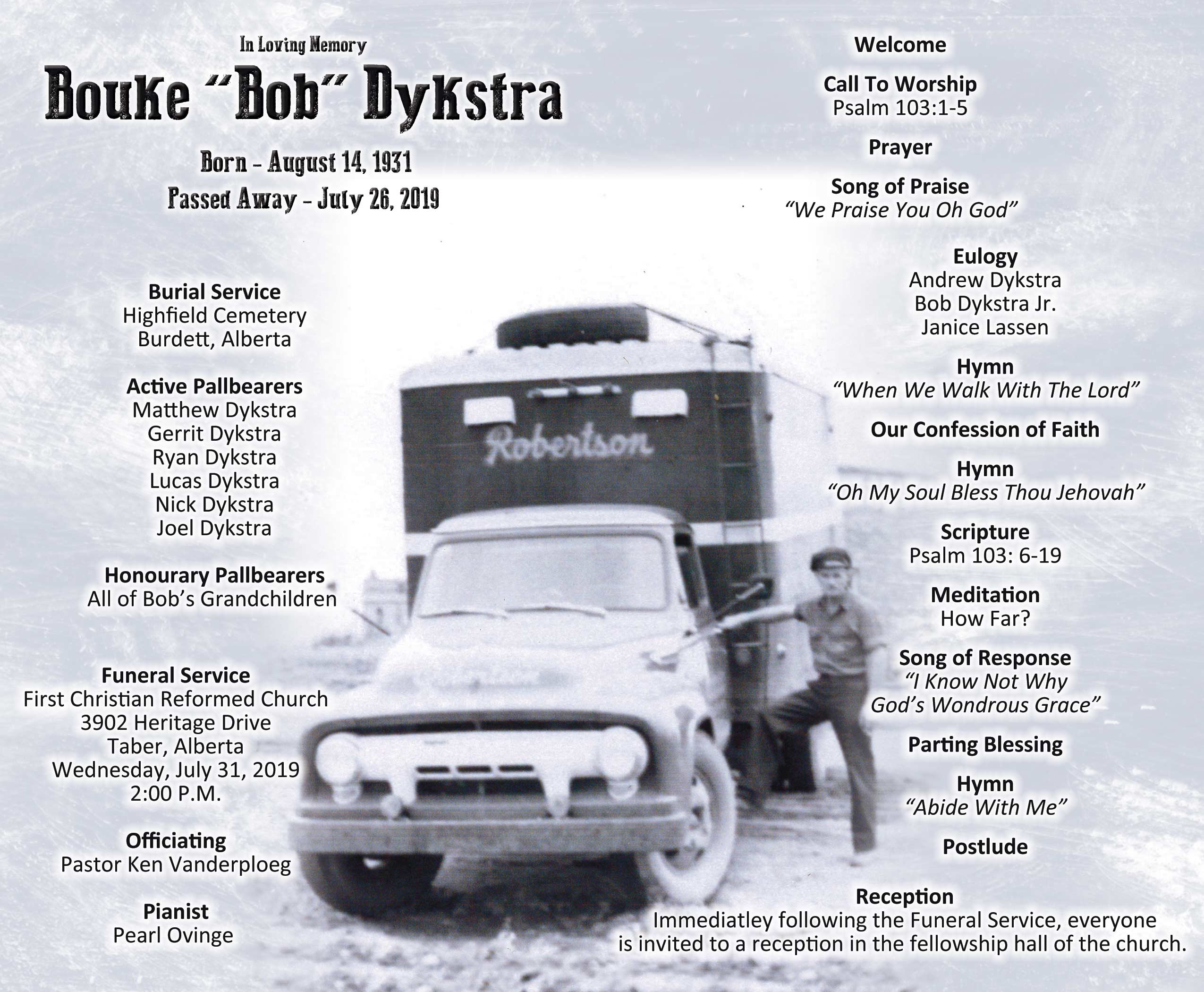 Bouke “Robert” Dykstra Sr. of Taber, was able to go to be with his Lord on Friday July 26, 2019 at the age of 87 years.