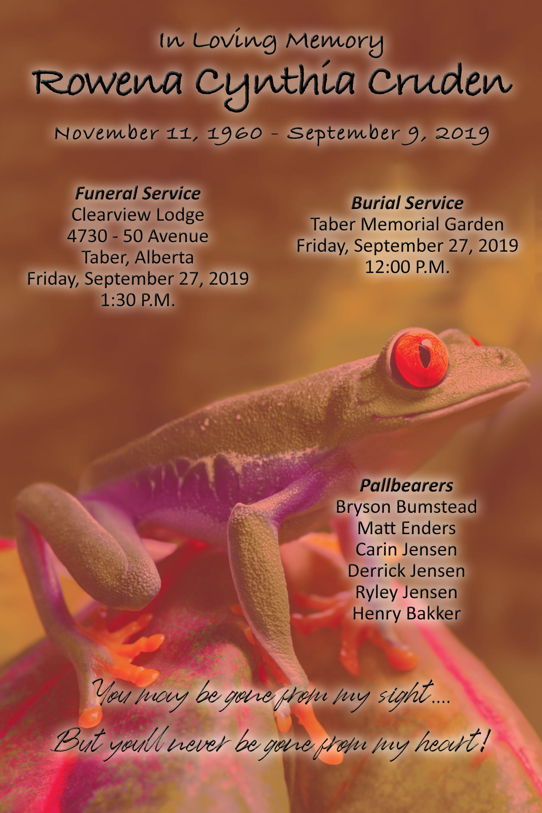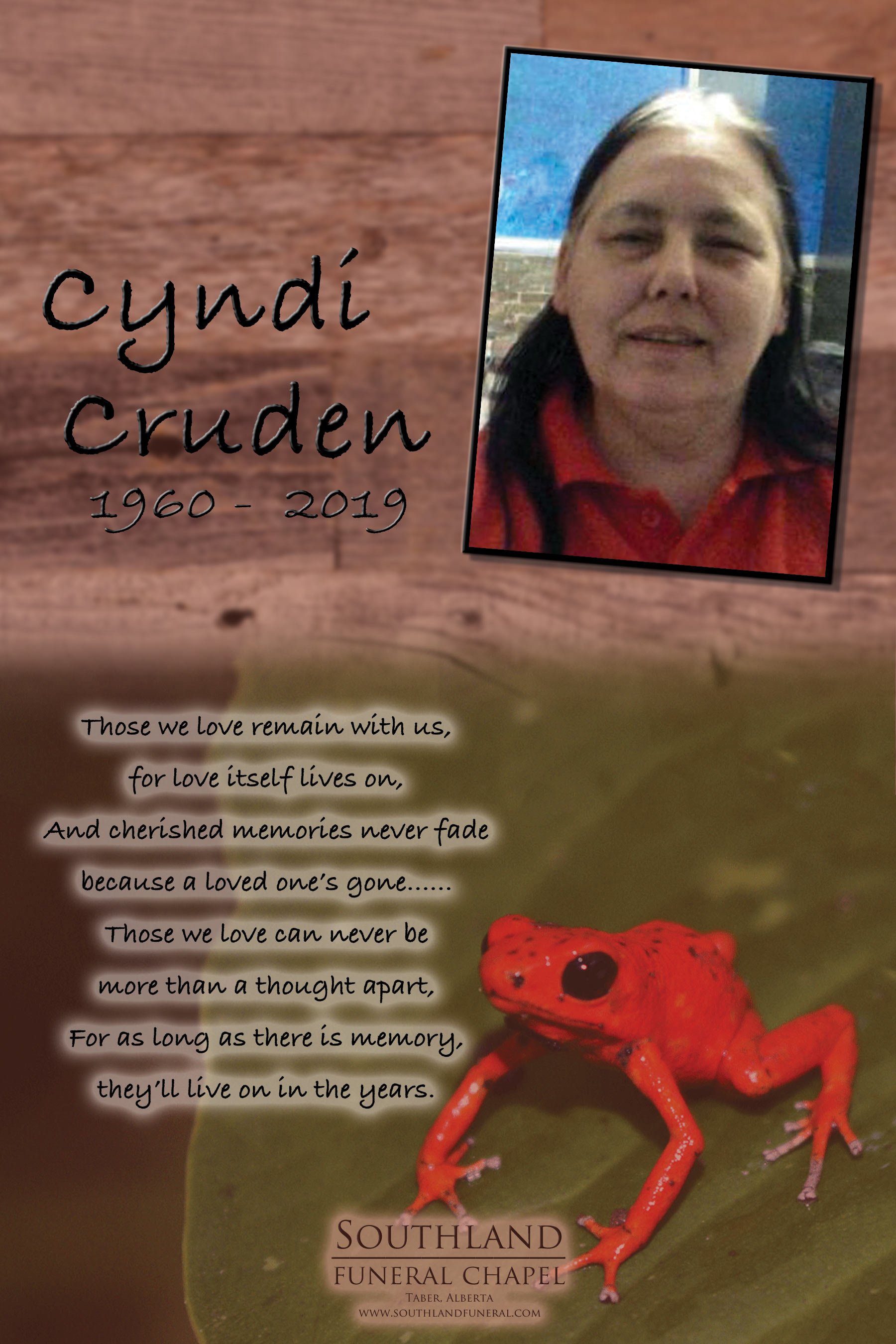 Rowena Cyndi Cruden, passed away in Taber on Monday, September 9, 2019 at the age of 58 years.