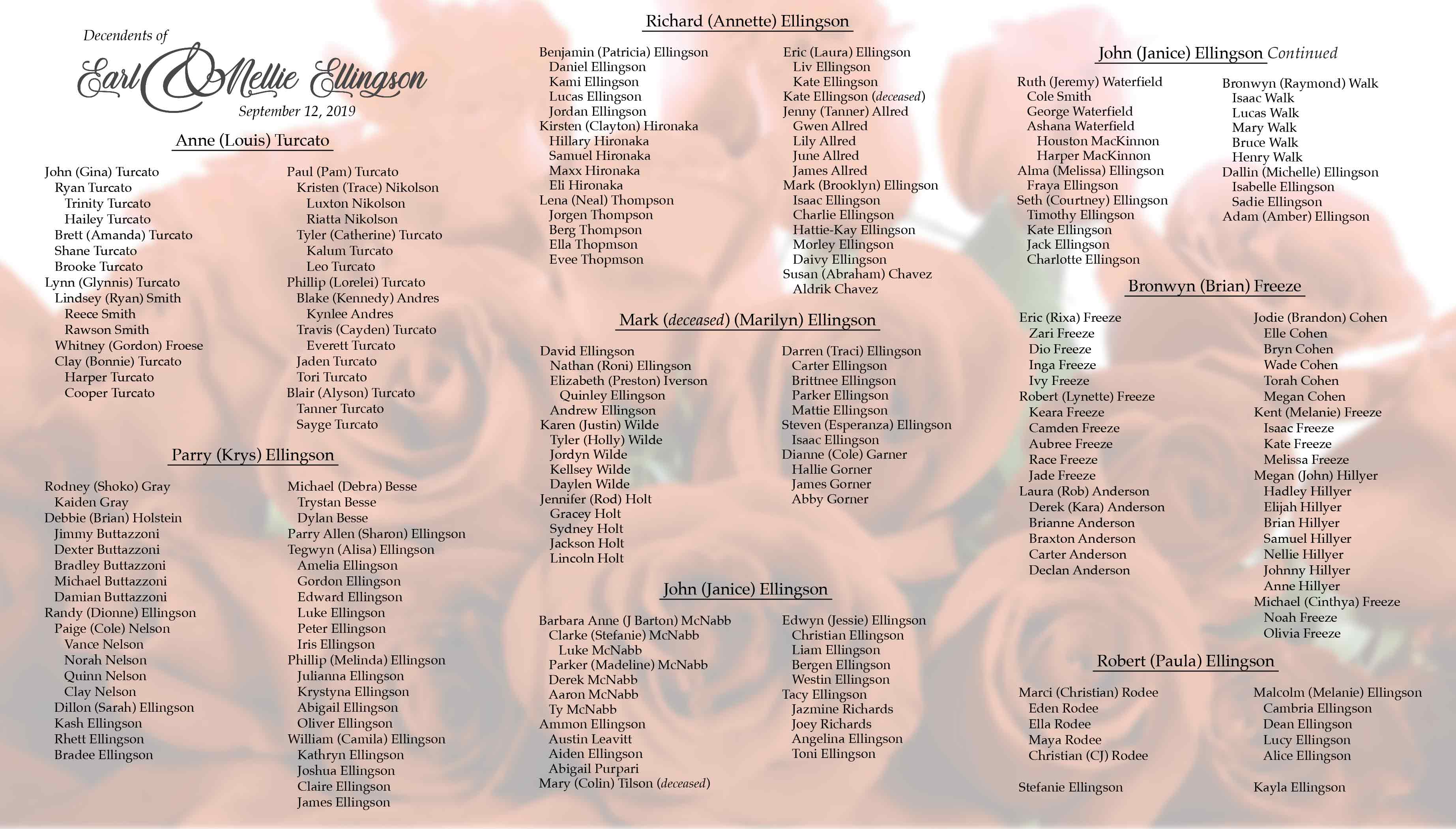 Nellie is survived by her children Anne (Louis) Turcato of Taber, Parry (Krystyna) Ellingson of Taber, Richard (Annette) Ellingson of Innisfail, John (Janice) Ellingson of Stirling, Bronwyn (Brian) Freeze of Raymond and Robert (Paula) Ellingson of Grapevine, Texas; daughter-in-law Marilyn Ellingson of Raymond; forty seven grandchildren, one hundred and fifty two great grandchildren and twenty two great great grandchildren.