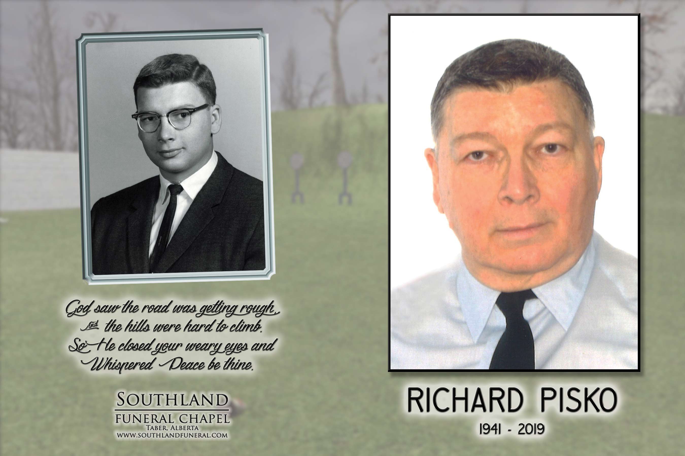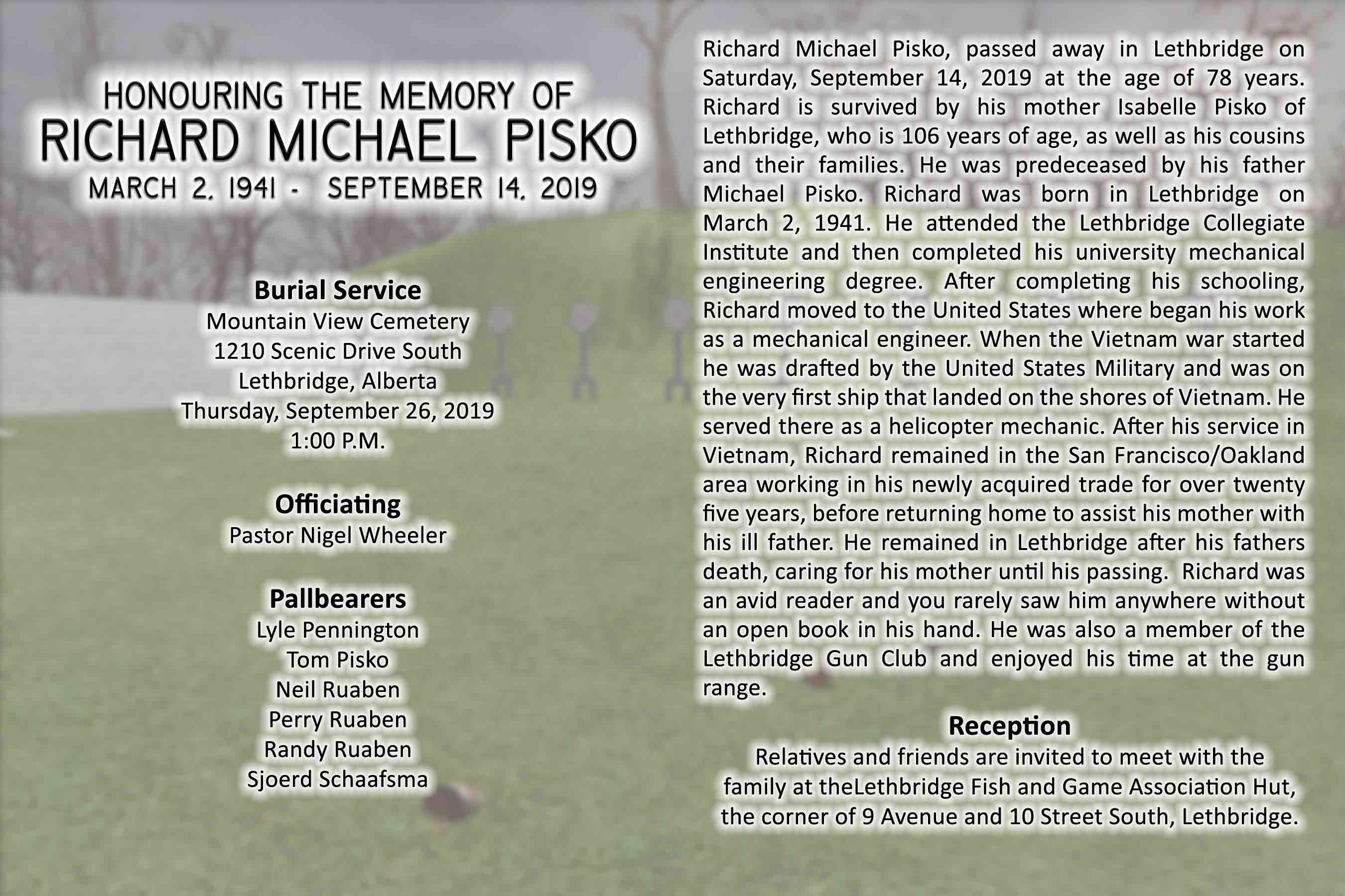 Richard is survived by his mother Isabelle Pisko of Lethbridge, who is 106 years of age, as well as his cousins and their families.