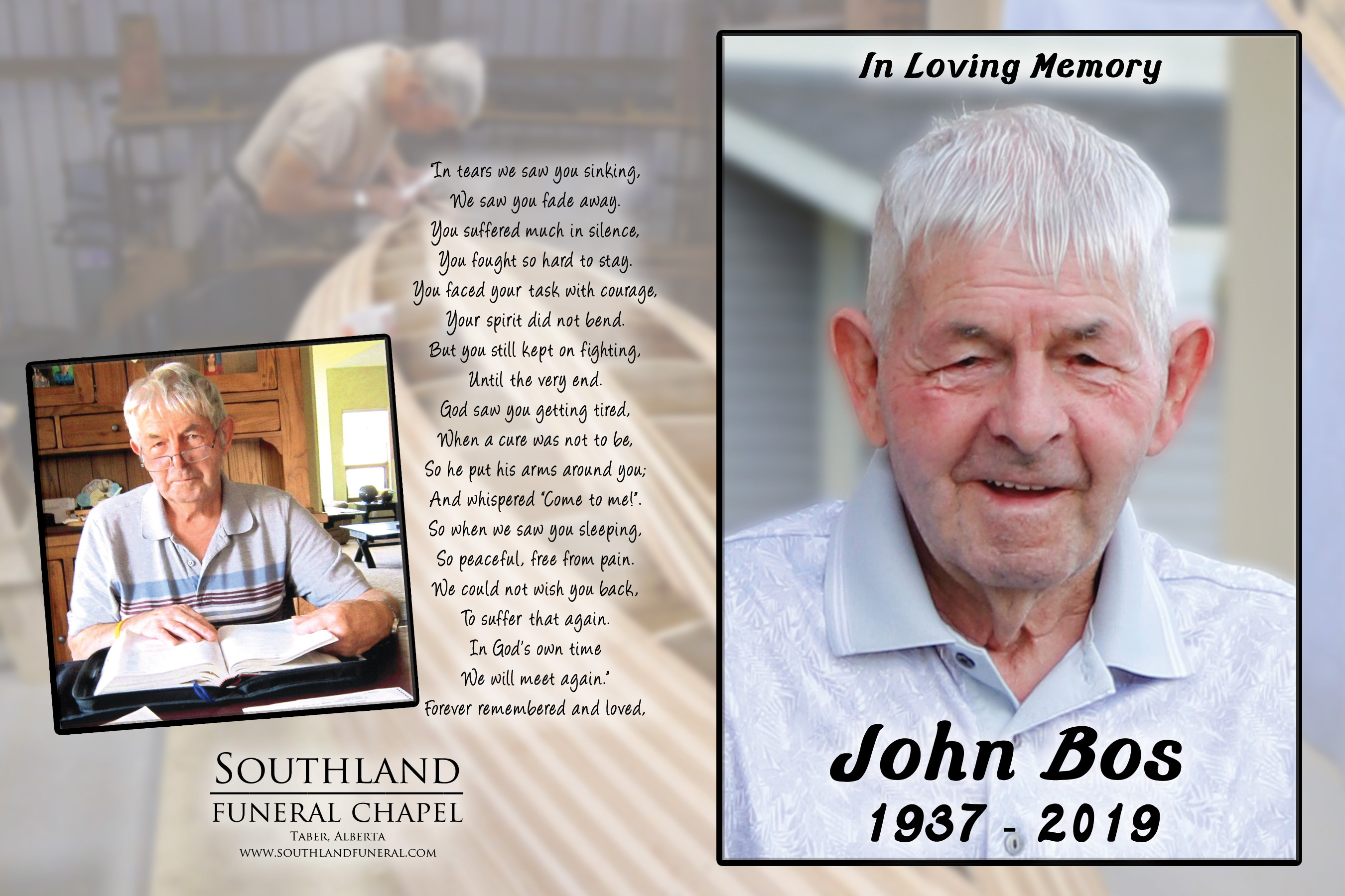 John was born in Opperdoes, the Netherlands, son of the late Klaas and Trintje (nee Vijn) Bos. John immigrated in 1950 at the age of twelve with his family soon after World War II to Canada where the family settled on a farm near Chatham, Ontario. After only two years of school in Canada, John started helping on the farm and took on various other jobs. John met the love of his life, Coby in 1956 and they married in 1959. When he was about twenty years old, he started a construction company with his father-in-law that he ran for twenty years. Due to economic difficulties John and the family moved to Taber to make new beginnings and worked for T&K Cabinets for one year. He then ventured into a construction company with his son Clarence for the next thirty years until John’s health started to decline. John had a love for working with his hands, building and woodworking all types of different projects.