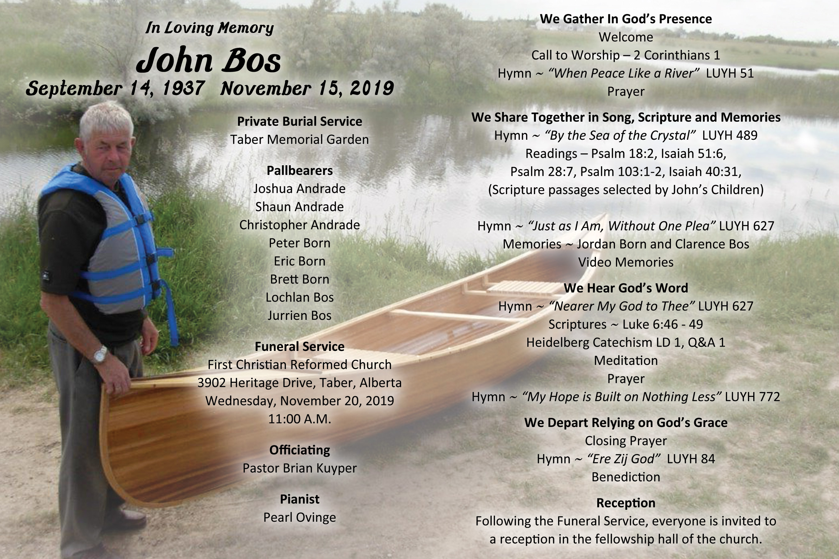 The Funeral Service was held at the First Christian Reformed Church, 3902 Heritage Drive, Taber on Wednesday, November 20, 2019 at 11:00 A.M.