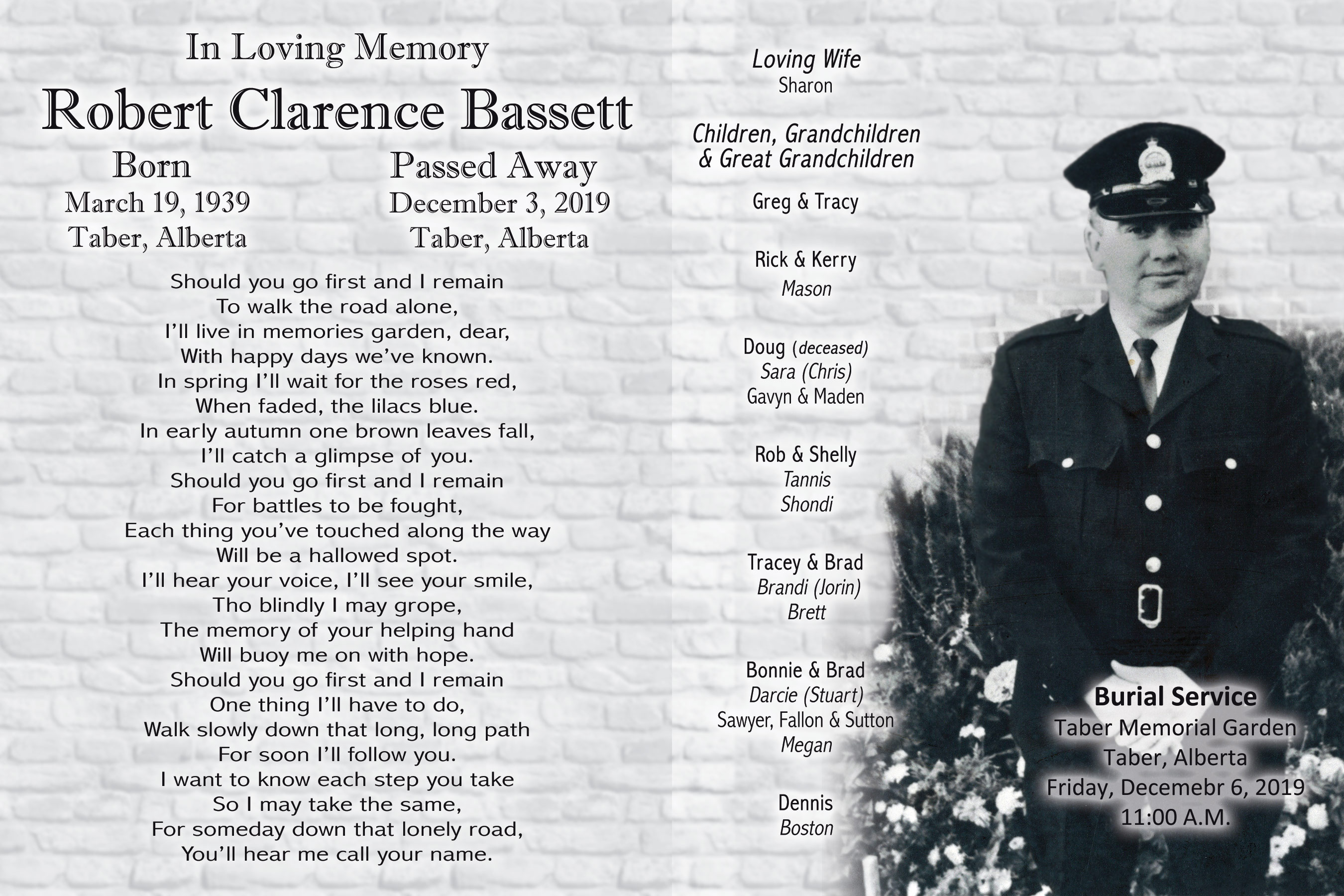 A private burial service was held at the Taber Memorial Garden on Friday, December 6, 2019.
