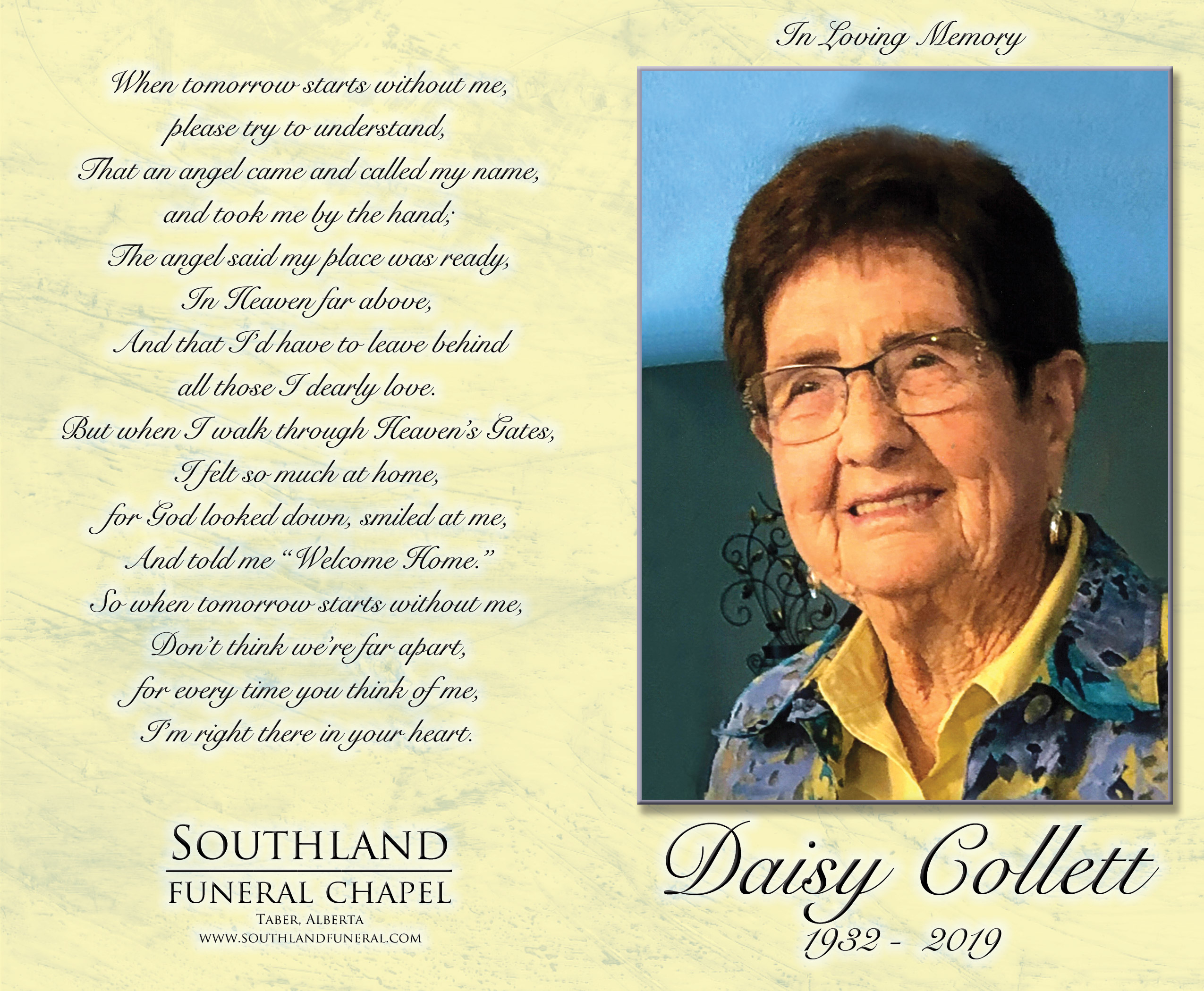 Daisy Louise Collett, beloved wife of the late Harold Collett, passed away peacefully in Taber on Sunday, December 29, 2019 at the age of 87 years.
