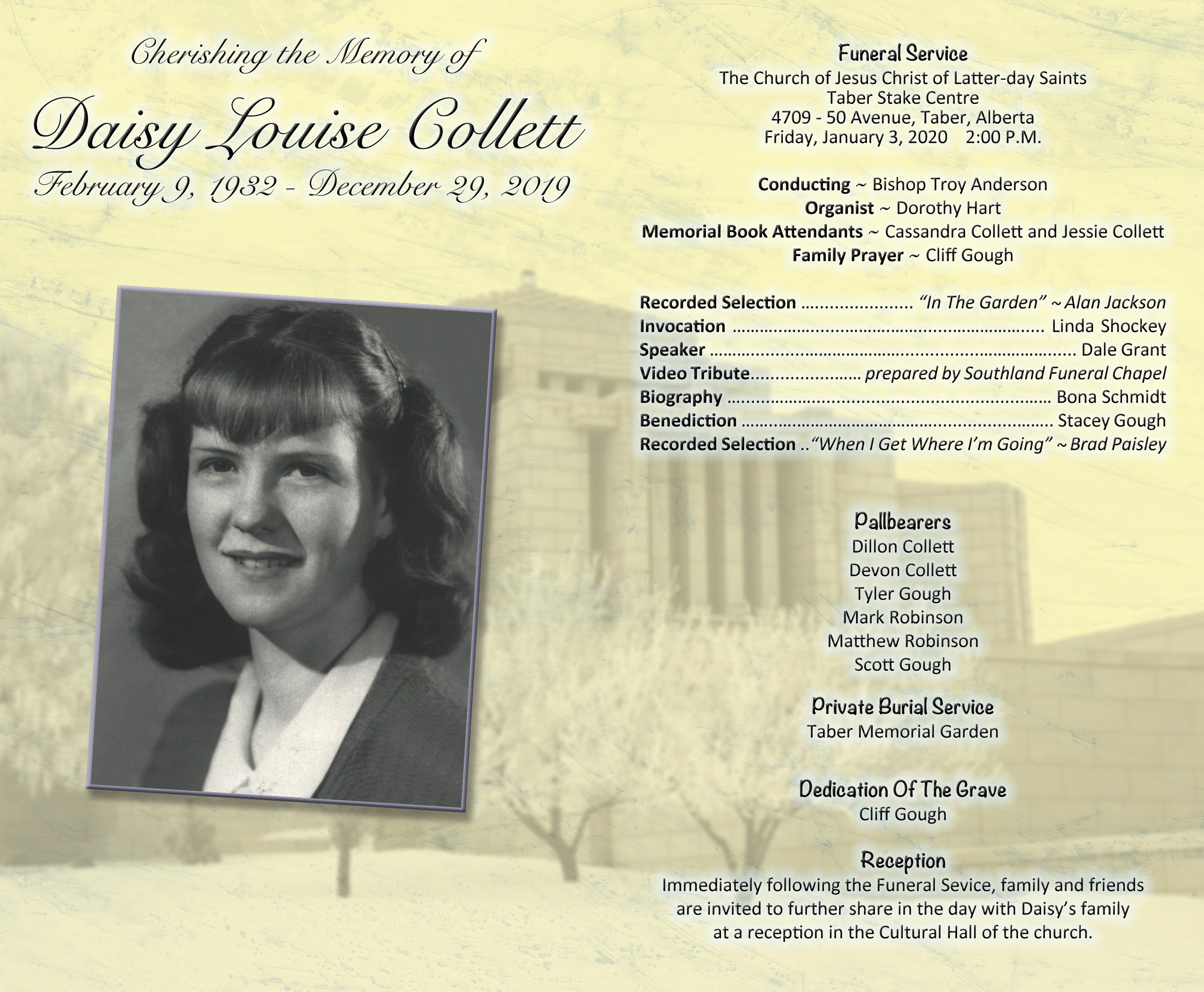 The Funeral Service was held at The Church of Jesus Christ of Latter-day Saints, Taber Stake Centre, 4709 - 50 Avenue, Taber on Friday, January 3, 2020 at 2:00 P.M. A private burial followed at the Taber Memorial Garden.