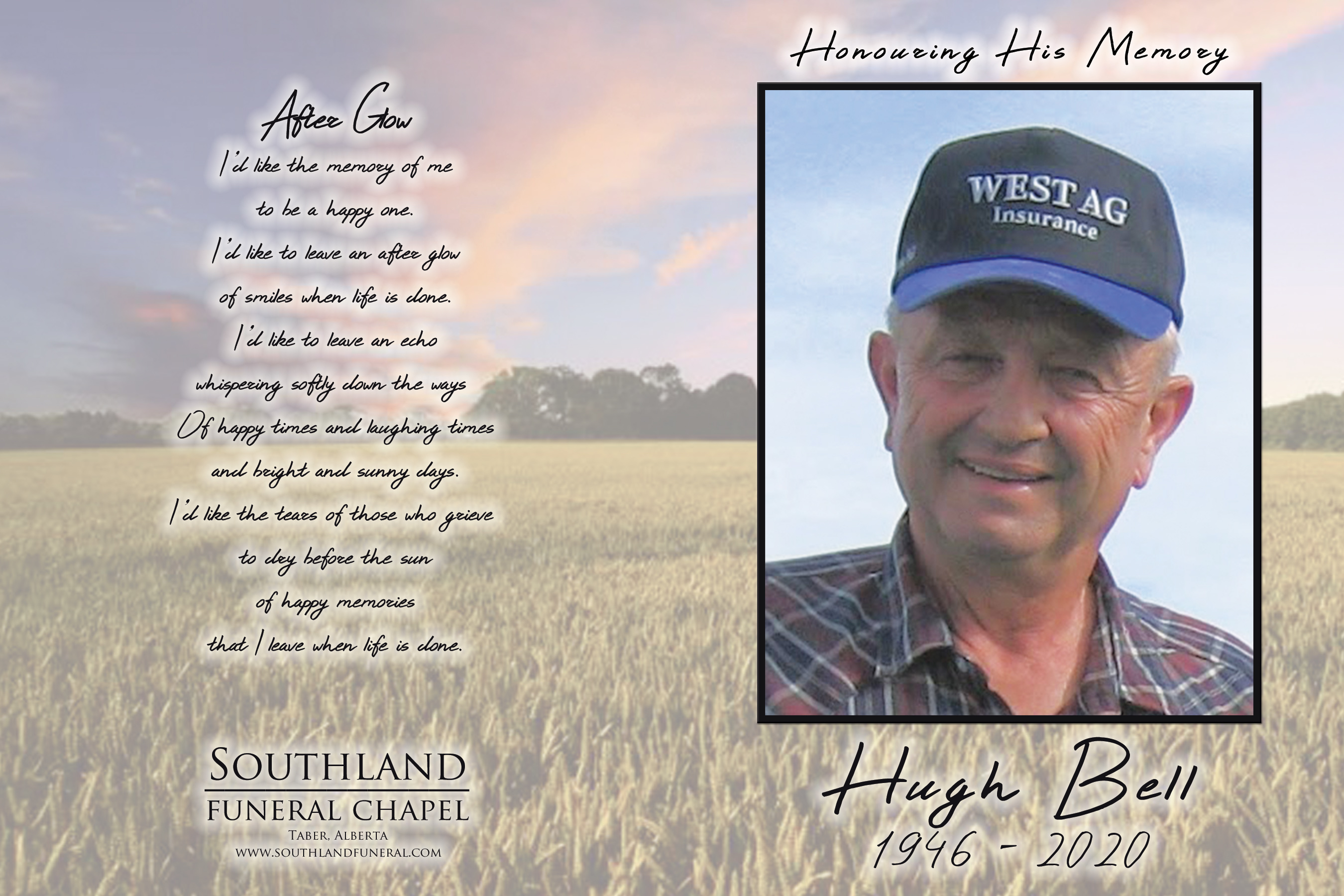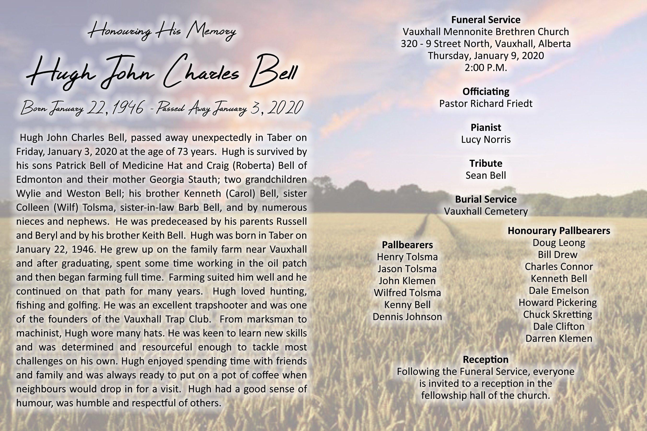 Hugh John Charles Bell, passed away unexpectedly in Taber on Friday, January 3, 2020 at the age of 73 years.