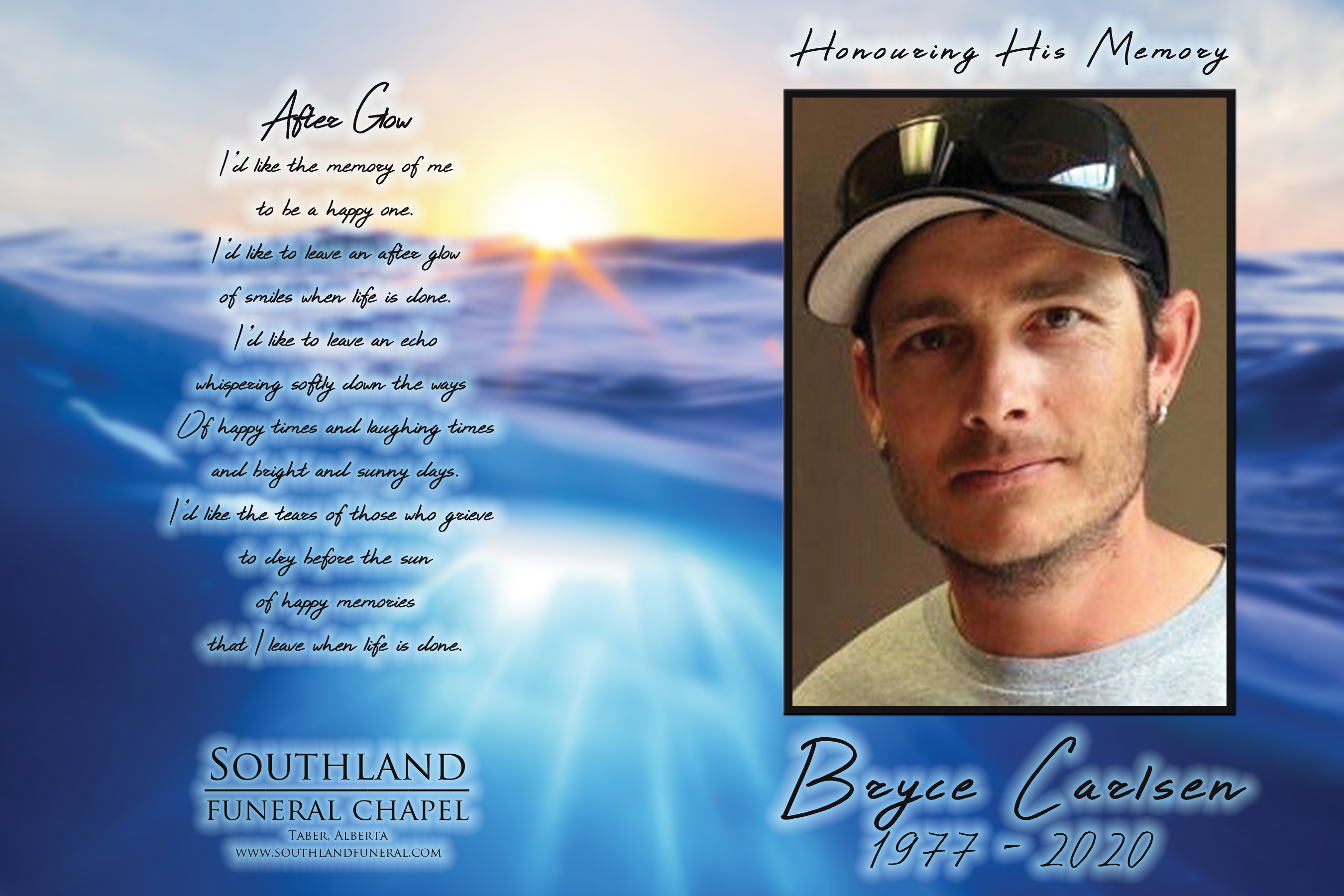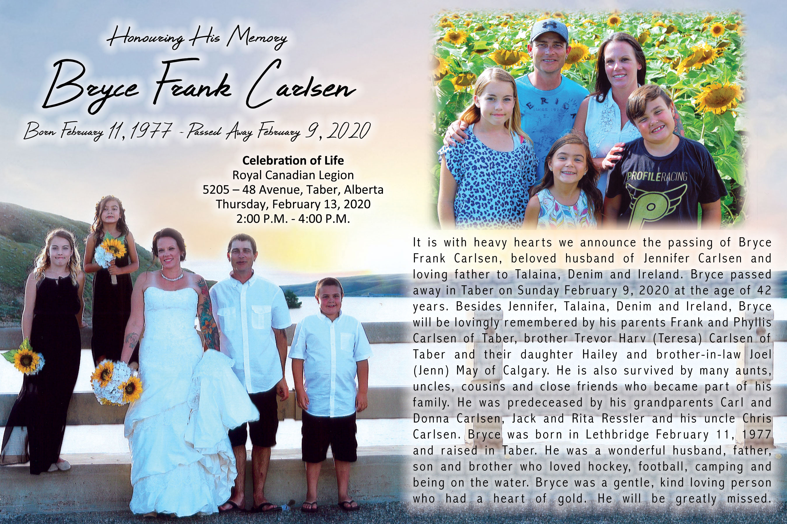 It is with heavy hearts we announce the passing of Bryce Frank Carlsen, beloved husband of Jennifer Carlsen and loving father to Talaina, Denim and Ireland. Bryce passed away in Taber on Sunday February 9, 2020 at the age of 42 years.