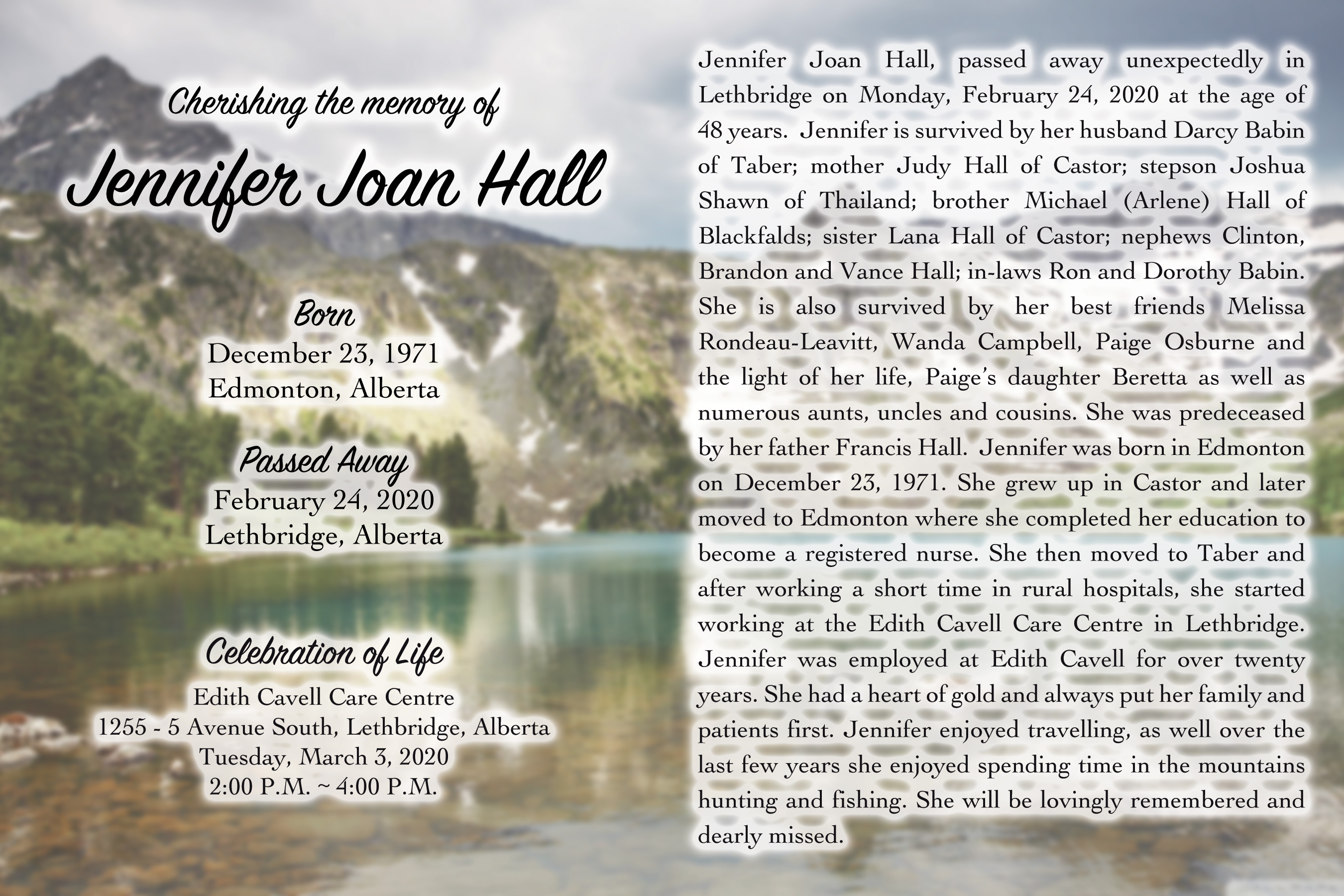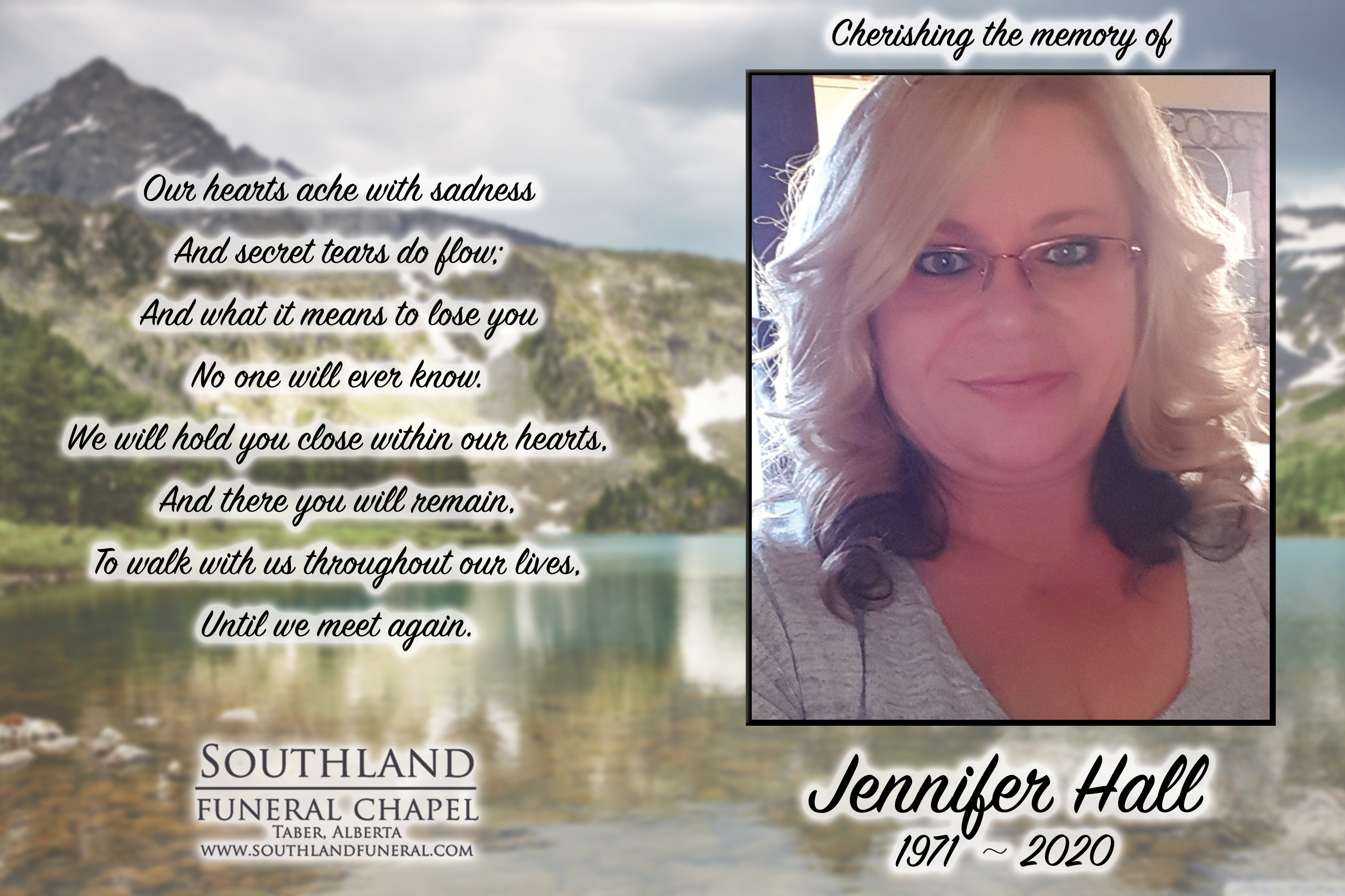 Jennifer Joan Hall, passed away unexpectedly in Lethbridge on Monday, February 24, 2020 at the age of 48 years.