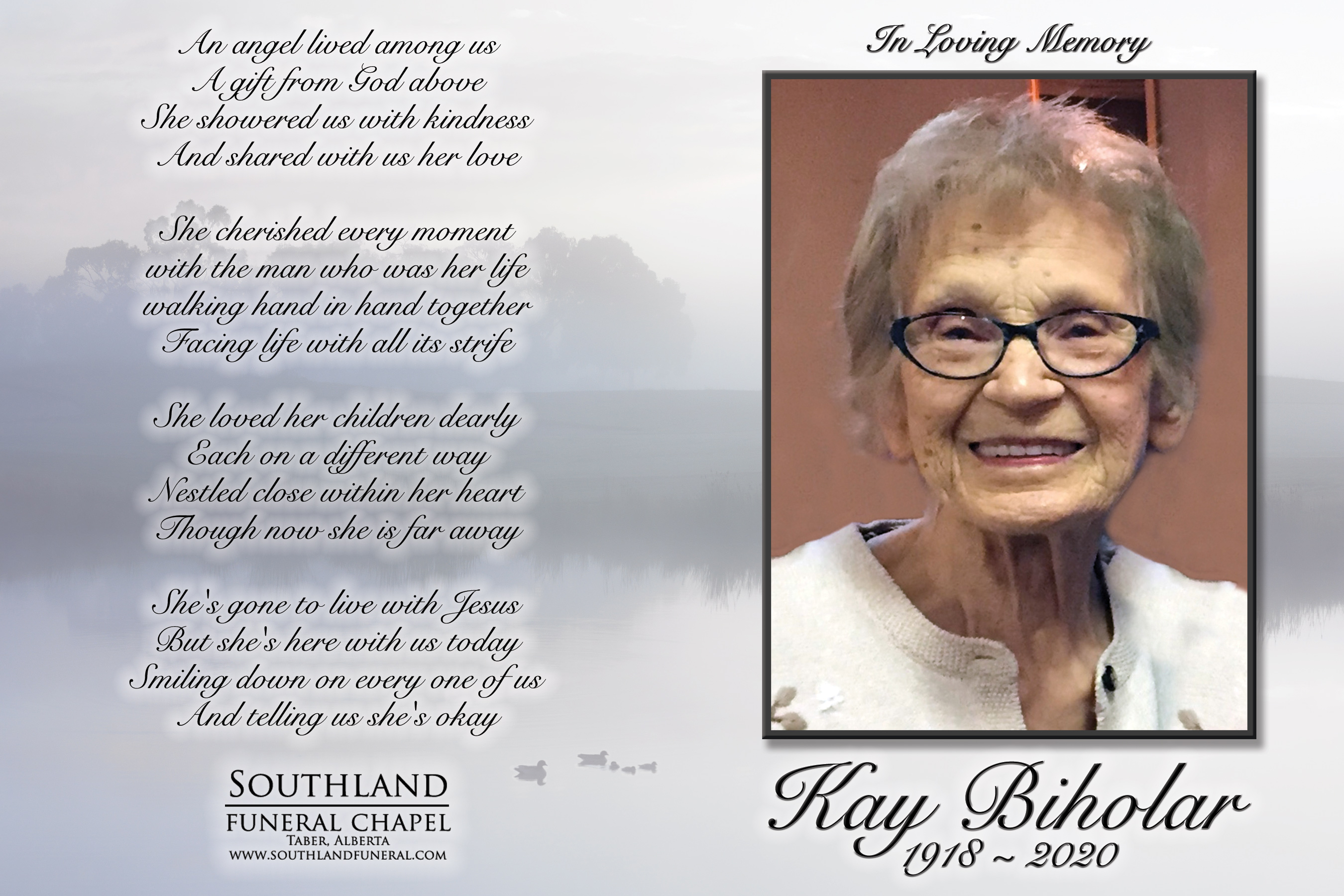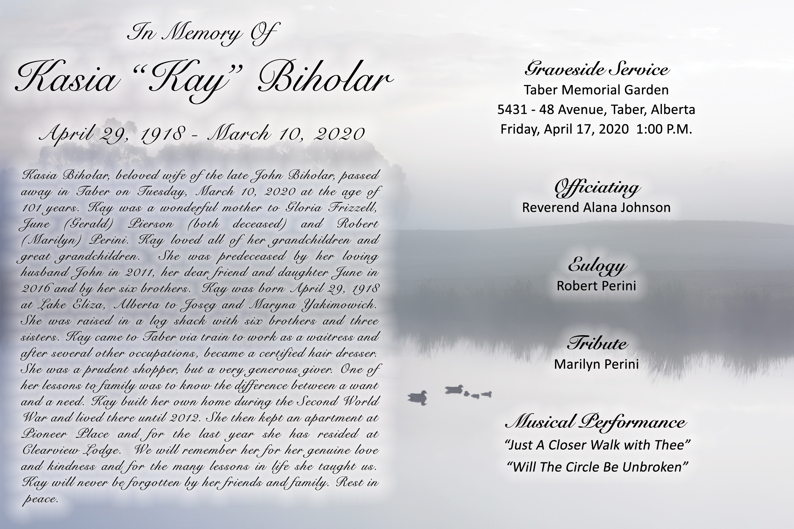 Kasia Biholar, beloved wife of the late John Biholar, passed away in Taber on Tuesday, March 10, 2020 at the age of 101 years.