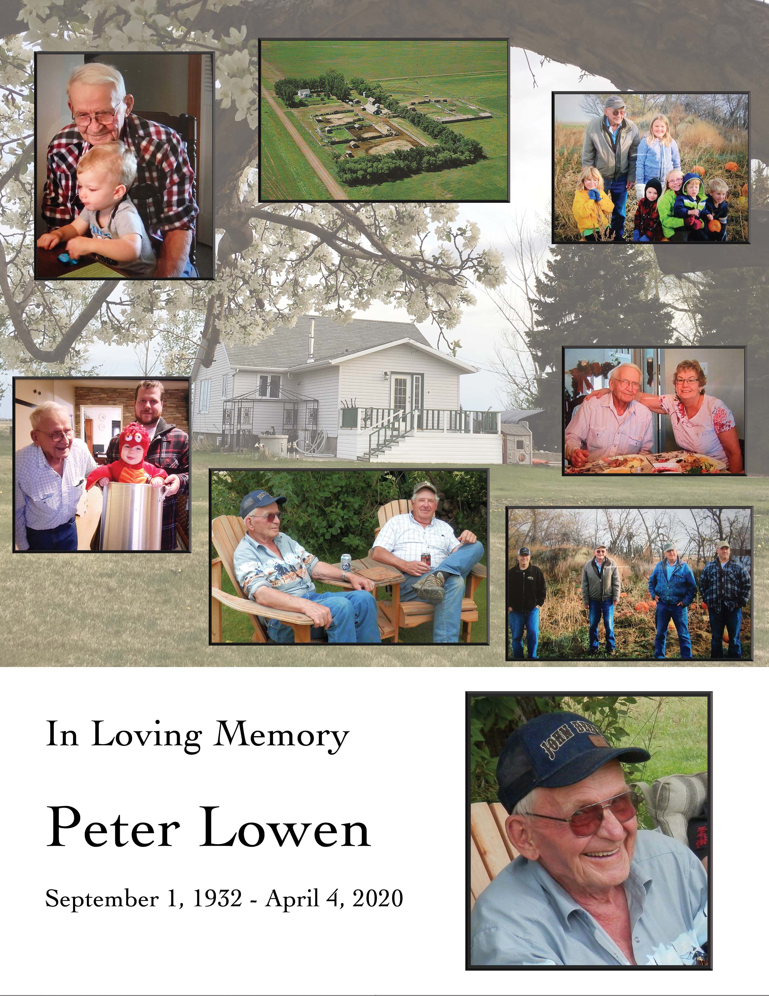 Pete was born September 1, 1932 in Beaverlodge, Alberta. He was one of twelve children born to Abe Lowen and Gertrude Lowen (nee Quiring), both born in Marienthal, Russia. The family homesteaded near Beaverlodge. In 1945, as a growing family, they moved to a farm northeast of Vauxhall, approximately seventy five years ago. The second residents on newly farmed prairie. On the family homestead, he lived a full and busy life. Pete was a kind man, always ready to help both family and neighbor. His big grin and twinkling blue eyes will be greatly missed.