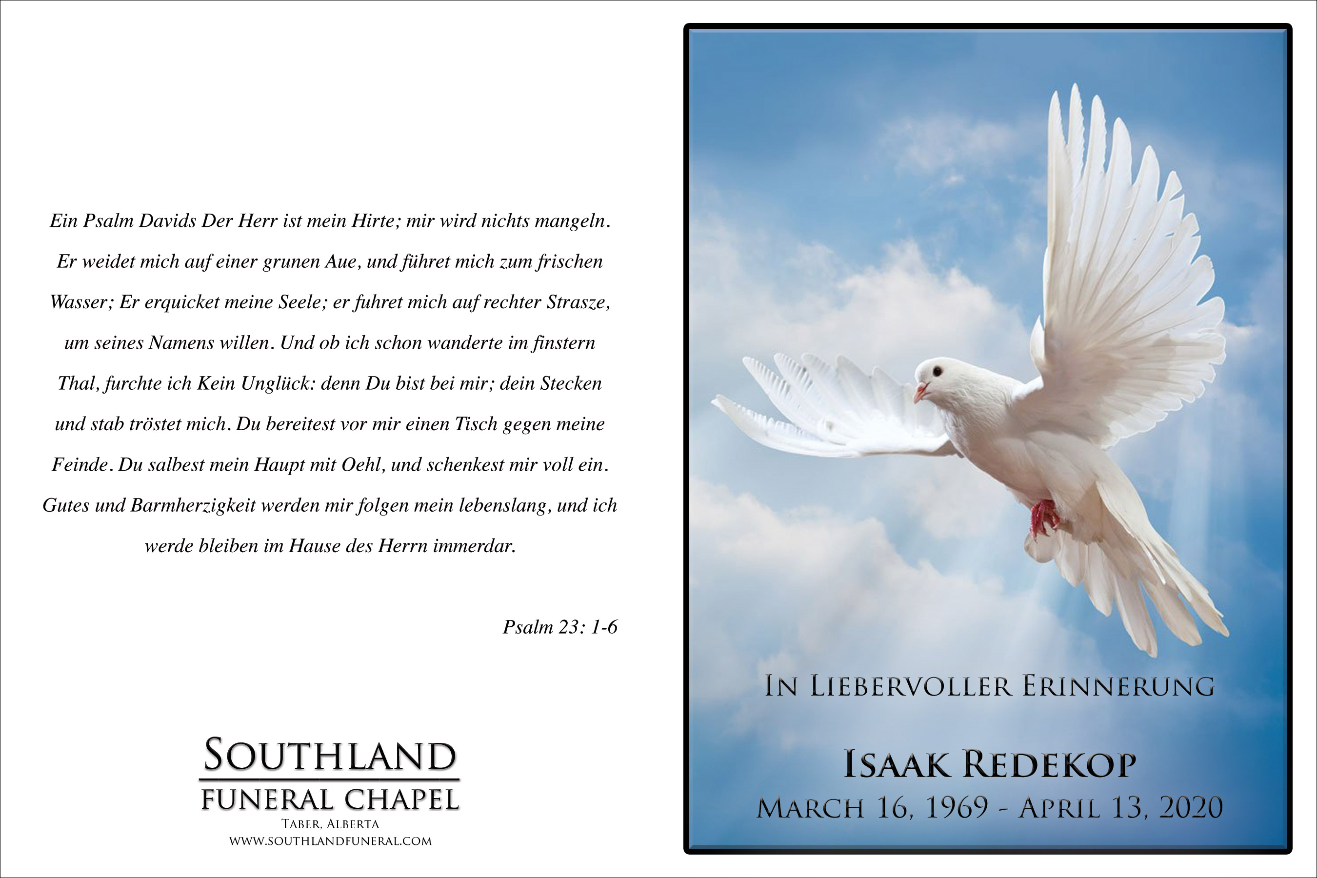 Isaak Redekop, beloved husband of Marie Redekop, passed away in Taber on Monday, April 13, 2020 at the age of 51 years.
