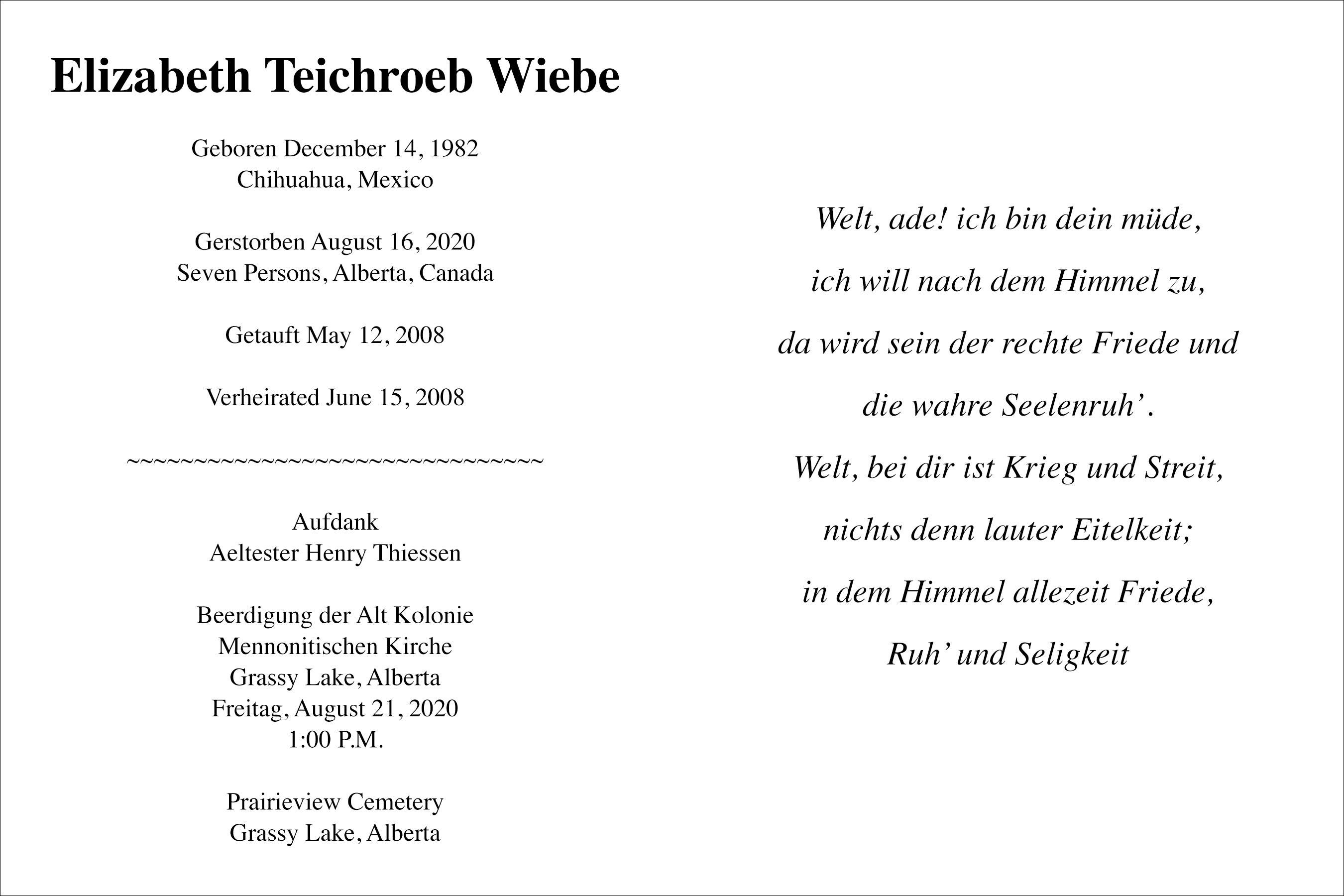 Elizabeth Teichroeb Wiebe, beloved wife of David Wiebe, passed away in Seven Persons on Sunday, August 16, 2020 at the age of 37 years.