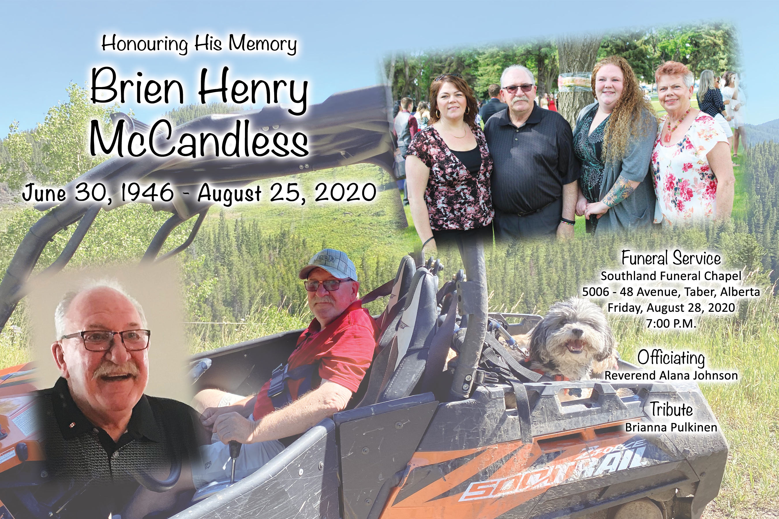 With saddened hearts we announce the unexpected passing of Brien Henry McCandless, beloved husband, father and grampy in Taber on Tuesday, August 25, 2020 at the age of 74 years.