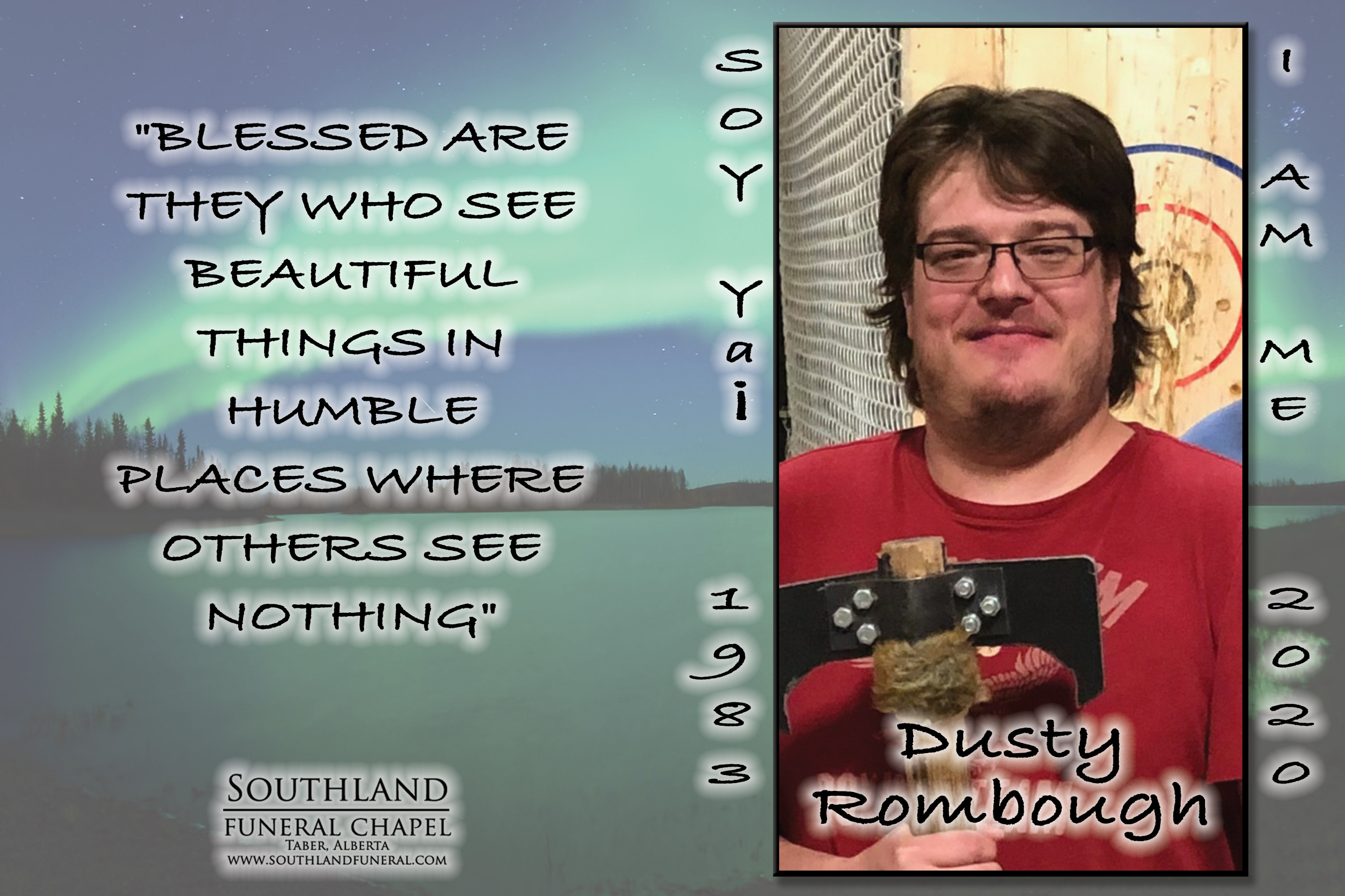 Dusty was born in Taber on March 28, 1983 as a little tiny five pound two ounce gift from above who was a fighter right from the start. So full of life and love always having a way of wrapping your heart around his little finger. Dusty literally loved life, he lived loudly and outside the box, dancing to the beat of his own drum. He never took no for an answer whether it be from his mama, dad, bossy older sisters or any curve ball thrown at him. We believe this is what made him the entrepreneur he was at thirteen up until just a week ago. Opening his own massage therapy practice, he was so excited and how fitting his business slogan “Soy Ya¡” I am me.
