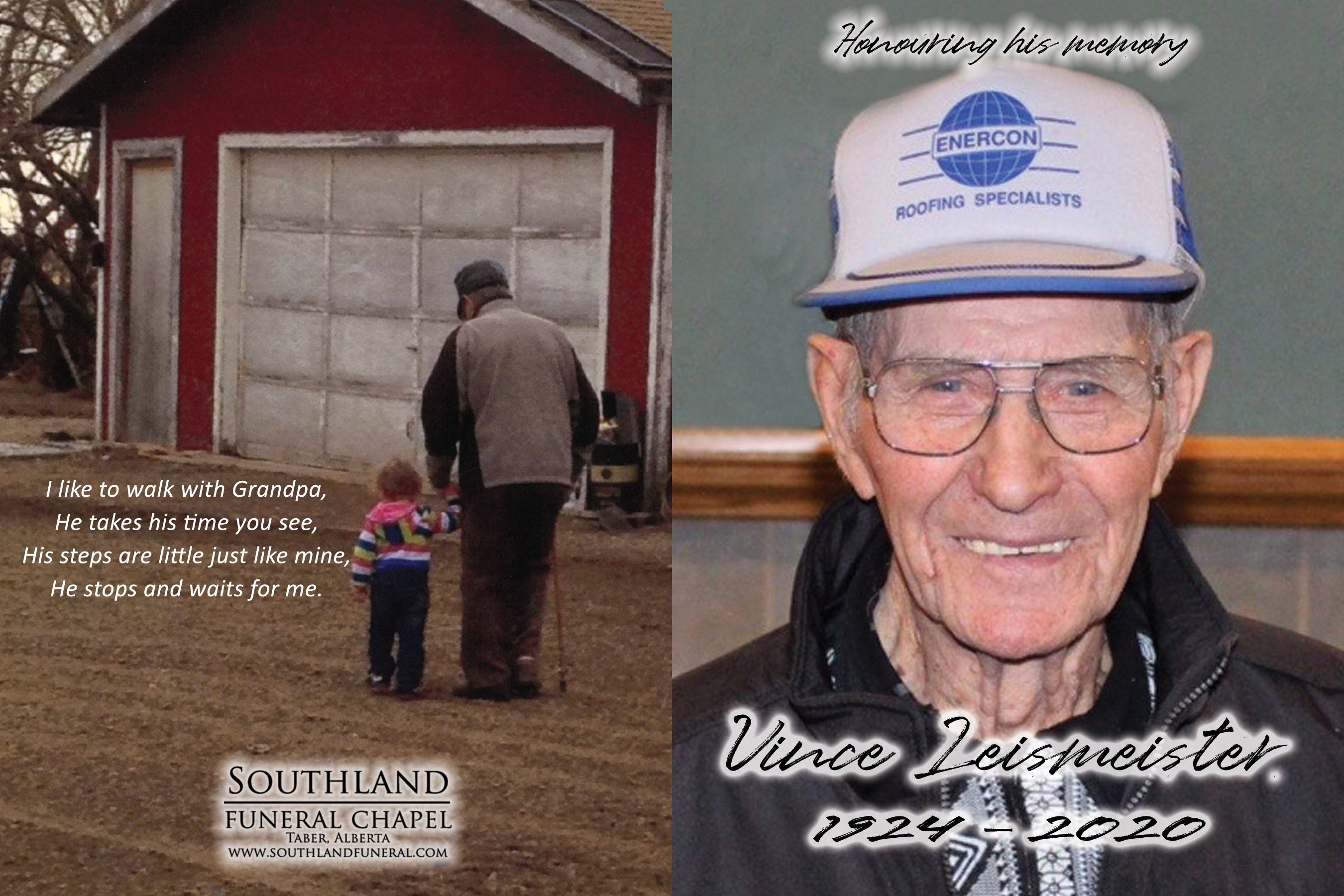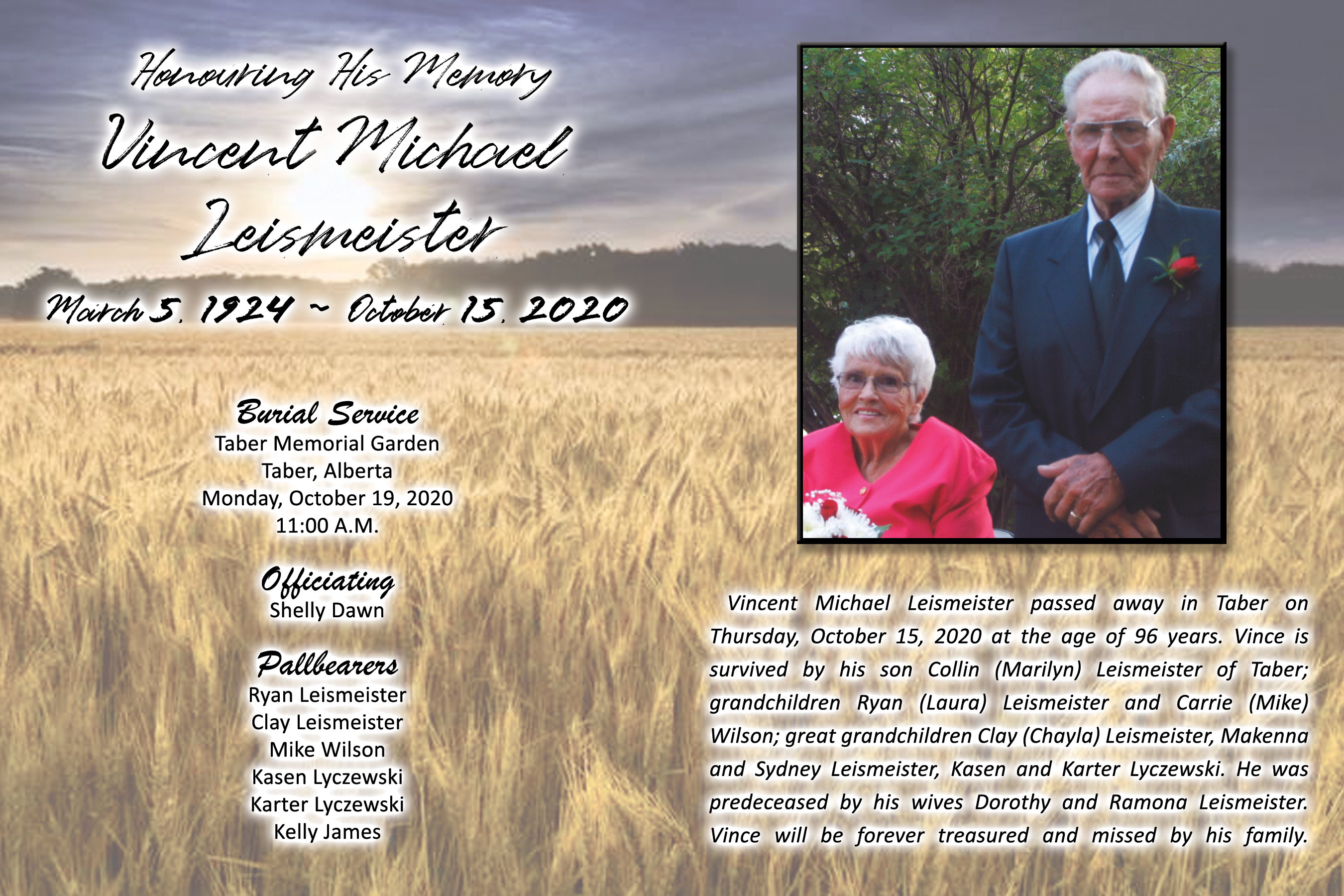 Vincent Michael Leismeister passed away in Taber on Thursday, October 15, 2020 at the age of 96 years.