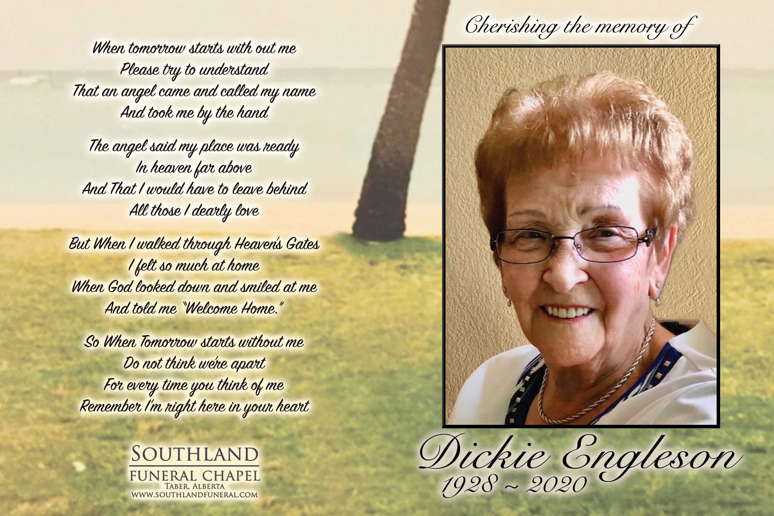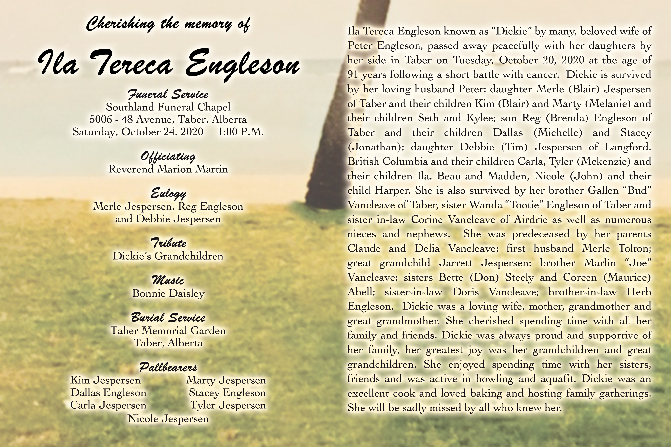 Dickie is survived by her loving husband Peter; daughter Merle (Blair) Jespersen of Taber and their children Kim (Blair) and Marty (Melanie) and their children Seth and Kylee; son Reg (Brenda) Engleson of Taber and their children Dallas (Michelle) and Stacey (Jonathan); daughter Debbie (Tim) Jespersen of Langford, British Columbia and their children Carla, Tyler (Mckenzie) and their children Ila, Beau and Madden, Nicole (John) and their child Harper. She is also survived by her brother Gallen “Bud” Vancleave of Taber, sister Wanda “Tootie” Engleson of Taber and sister in-law Corine Vancleave of Airdrie as well as numerous nieces and nephews.