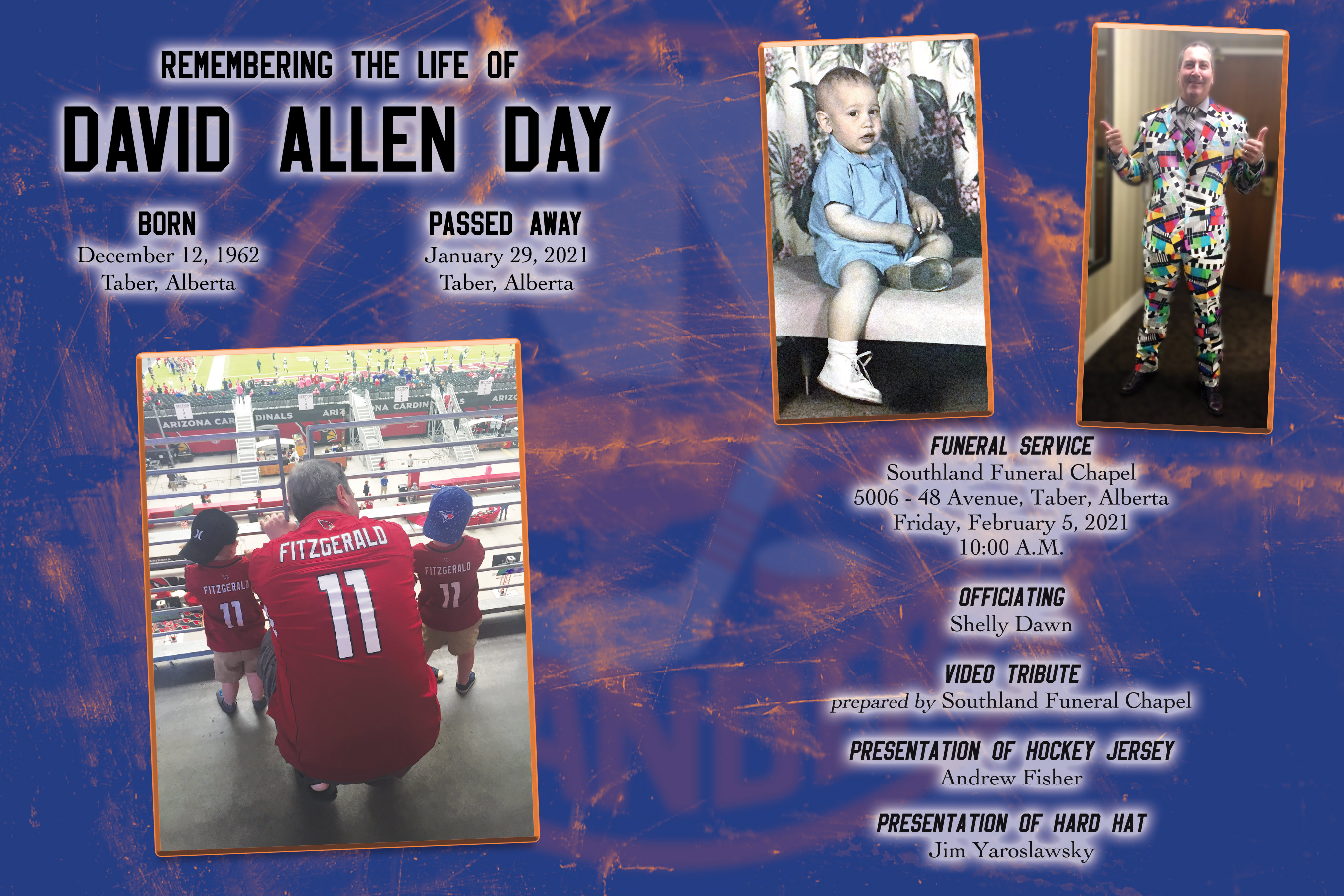 David was fun loving with a huge heart. He had a deep love of sports, playing hockey in both the commercial league and Old Timers in Taber. He loved watching minor hockey in town, was a long time season ticket holder for the Lethbridge Hurricanes and was a die hard New York Islanders fan. He also enjoyed watching football, cheering for the Edmonton Eskimos and travelling to NFL games in the United States. One of his fondest memories was travelling to Arizona to see a Cardinals game with his grandsons when they were one year old. His deep love of sports was apparent as he was almost always seen wearing a hockey or football jersey.