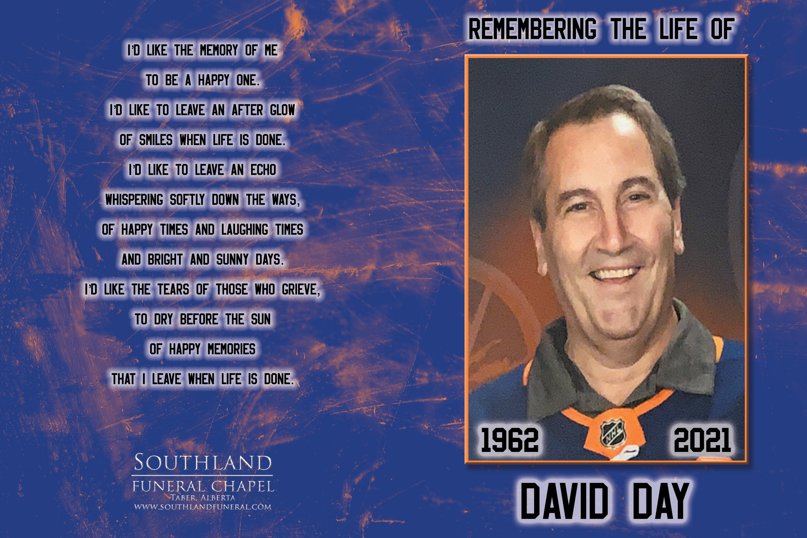 It is with great sadness that the family of David Allen Day announce his passing in Taber on Friday, January 29, 2021 at the age of 58 years, following a long battle with cancer.