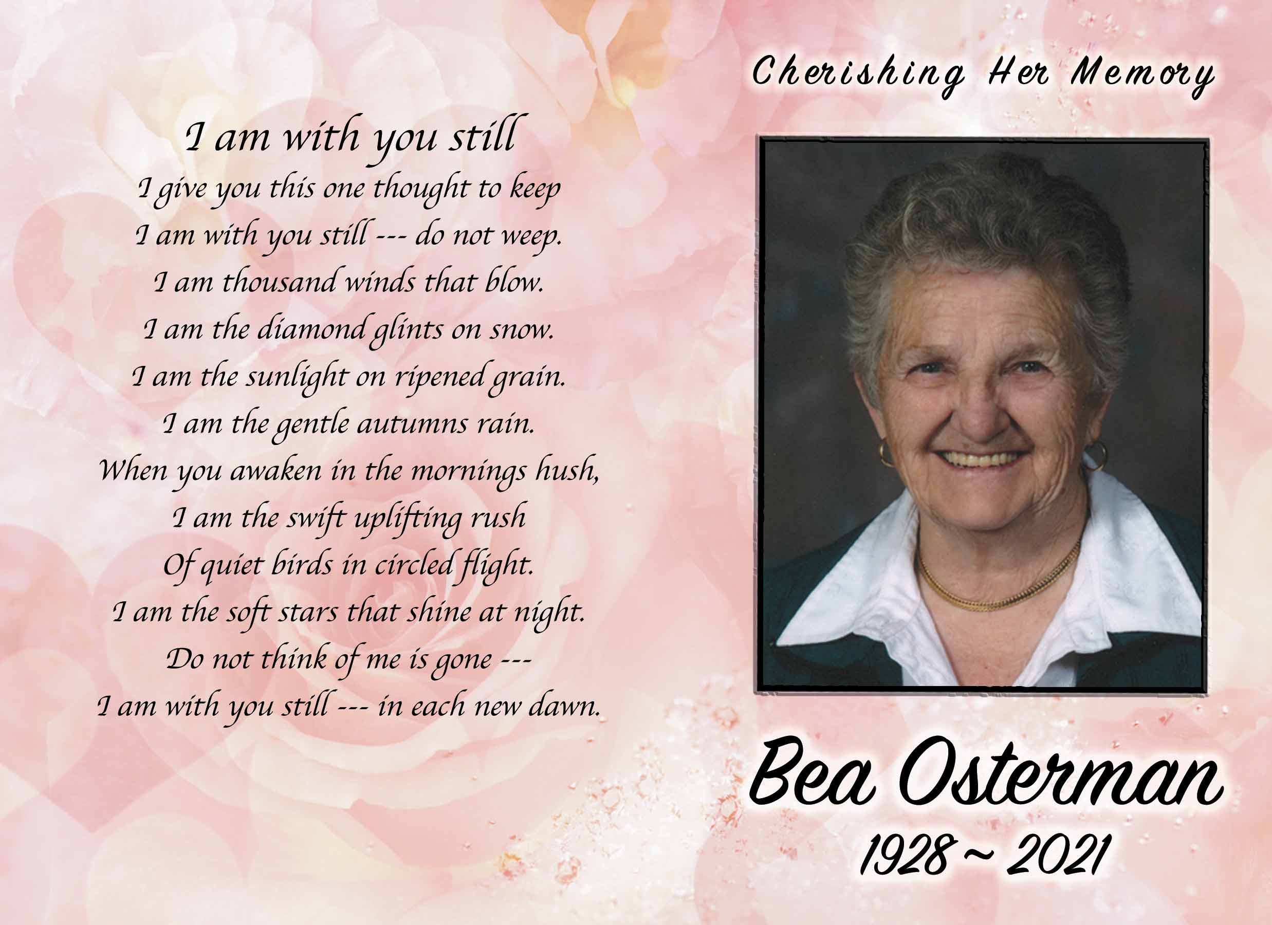 She was predeceased by her first husband John Piea and her second husband Herman Osterman; her daughter Muriel Piea and son James Piea; her mother Muriel Van Den Bosch (nee Stapleton), her father Fred Wrobel and step father Paul Van Den Bosch; brothers Roy Wrobel and Ray Wrobel; brothers-in-law Larry Kratt Sr. and Leo Hnetka.