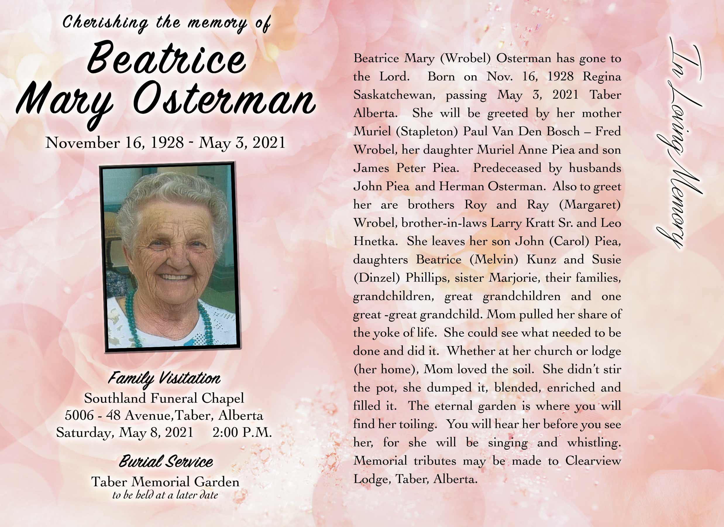 If friends so desire, memorial tributes in Bea’s name may be made directly to the Clearview Lodge Resident Council, 4730 - 50 Avenue, Taber, Alberta T1G 1N6.