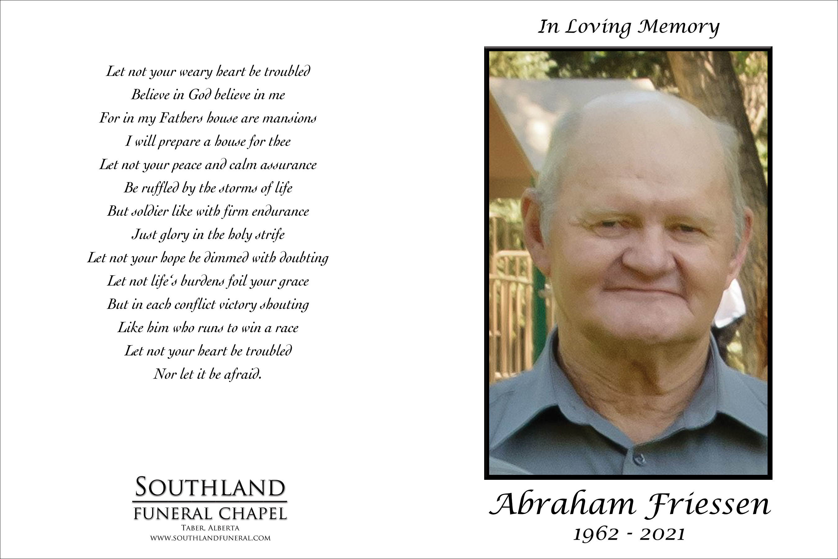 Abraham Wiebe Friessen, beloved husband of Maria Friessen, passed away in Lethbridge on Sunday, July 11, 2021 at the age of 59 years.