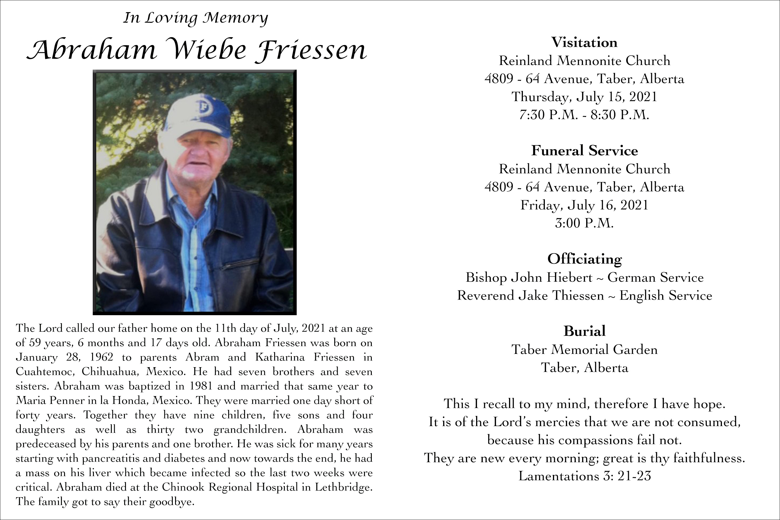 The Funeral Service was held at the Reinland Mennonite Church, 4809 - 64 Avenue, Taber on Friday, July 16, 2021 at 3:00 P.M. Burial followed at the Taber Memorial Garden.
