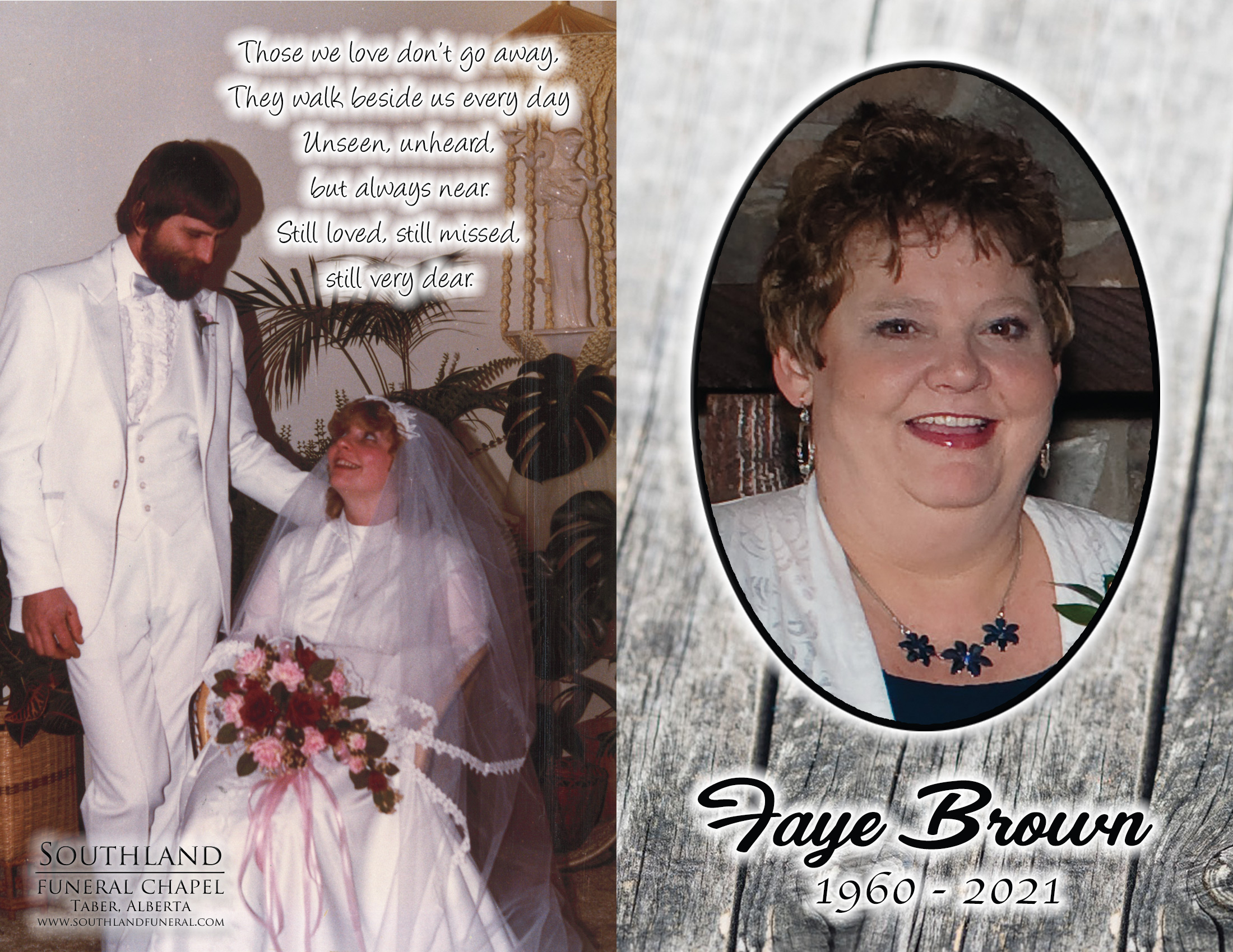 Maxine Faye Brown, beloved wife of Lance Brown, passed away in Taber on Sunday, July 11, 2021 at the age of 60 years.