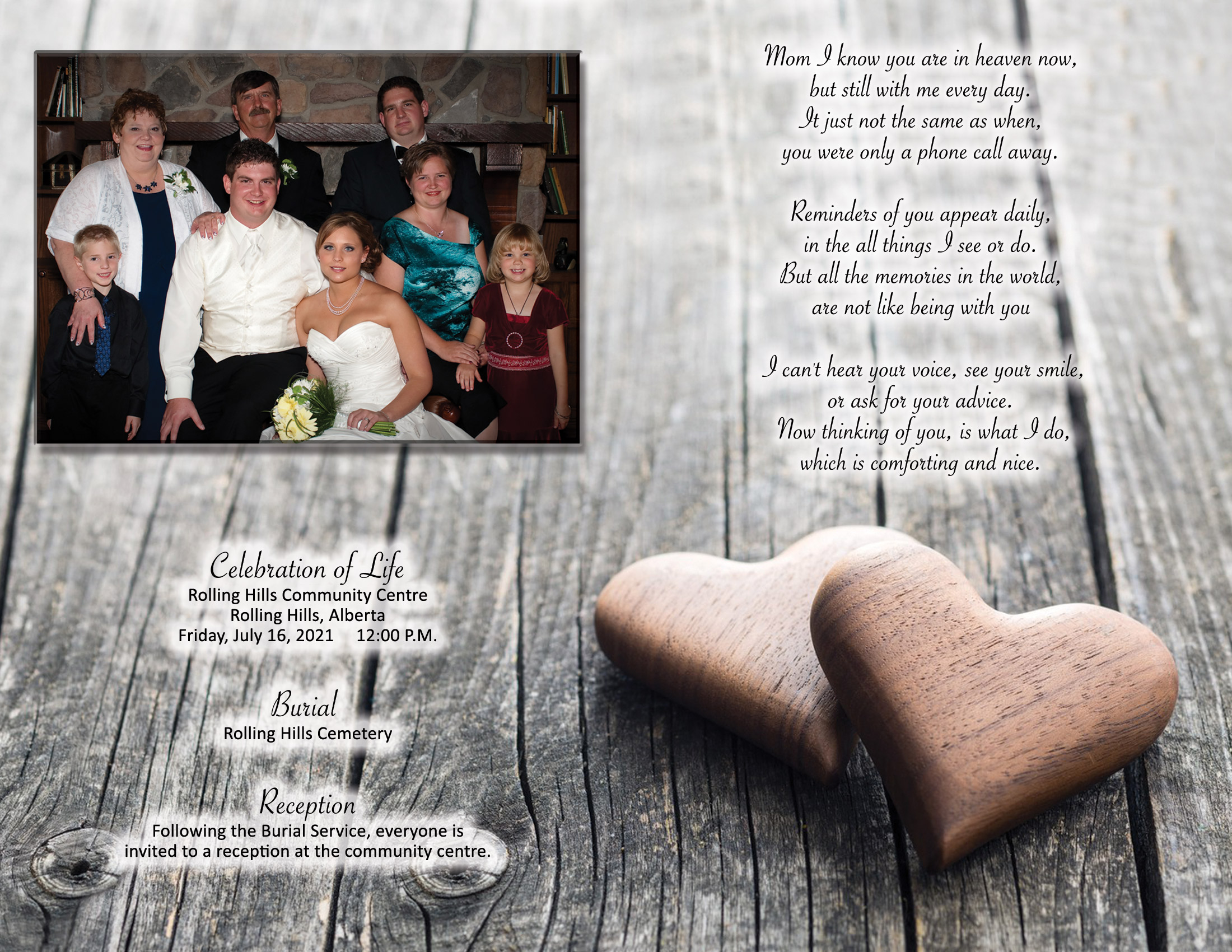 The funeral service was held at Rolling Hills Community Centre, corner of 3 Street and Highway 875, Rolling Hills on Friday, July 16, 2021 at 12:00 P.M. Burial followed at the Rolling Hills Cemetery.