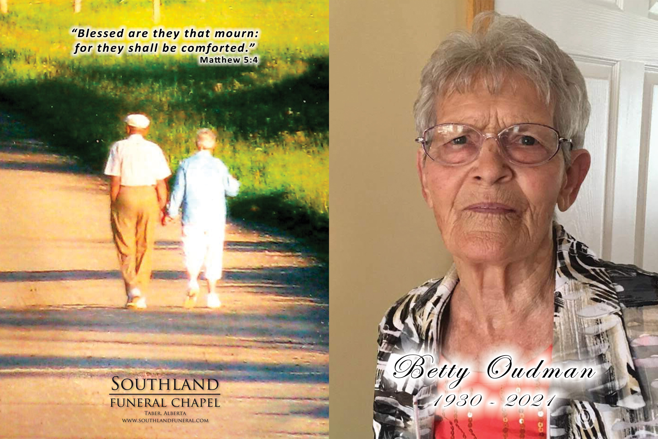 In the early hours of Wednesday, July 28, 2021, at the age of 90 years and 9 months, Betty Oudman (nee Aasman), departed to join her beloved husband, Homer Oudman, who has been watching over her from heaven since April 30, 2017. After a long struggle with declining health, she passed away peacefully in her sleep at home, knowing she was in the constant hearts and minds of her family.