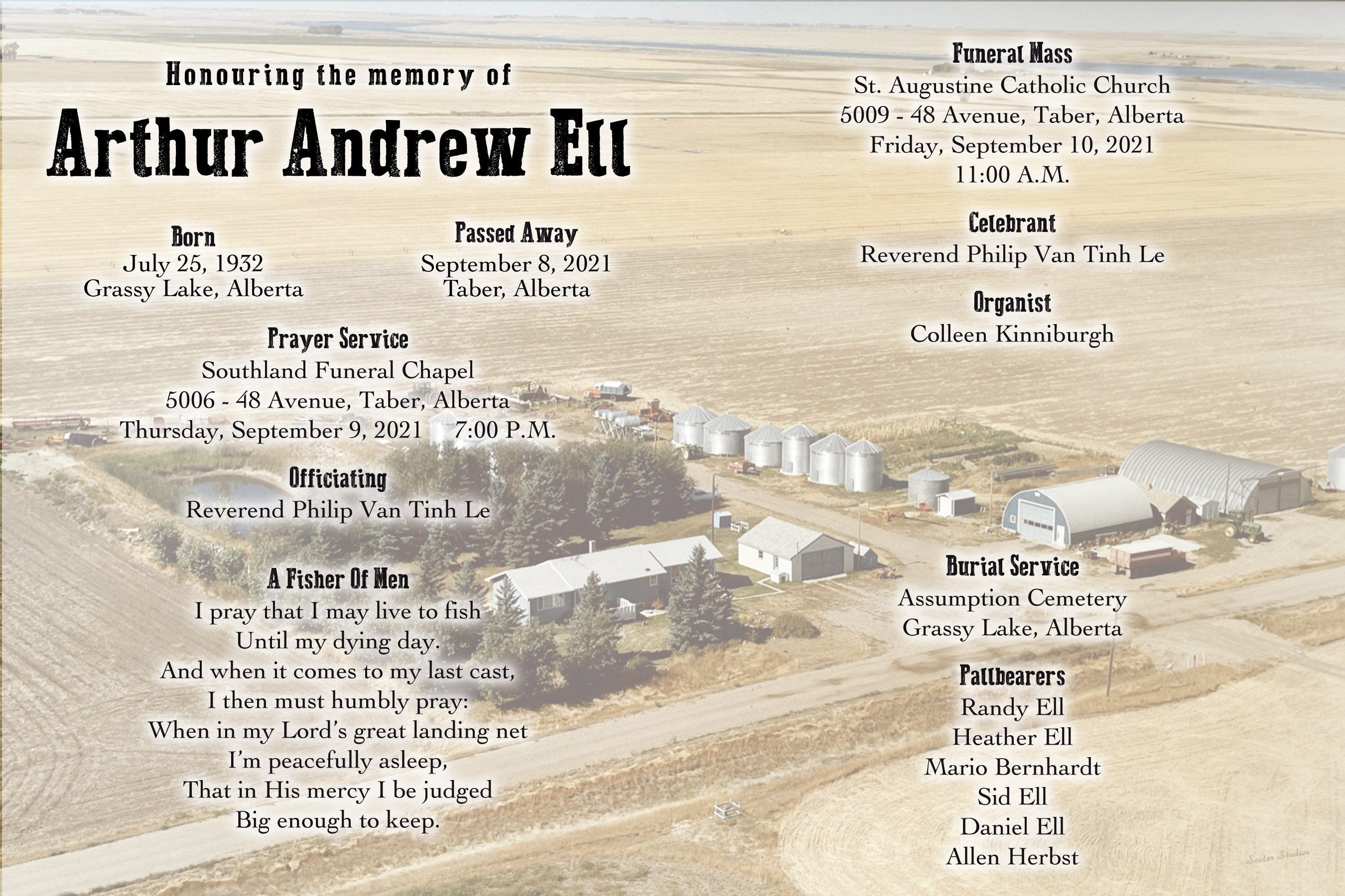 The Funeral Mass was celebrated at St. Augustine's Catholic Church, 5009 - 48 Avenue, Taber on Friday, September 10, 2021 at 11:00 A.M. Burial followed at the Assumption Cemetery, Grassy Lake.