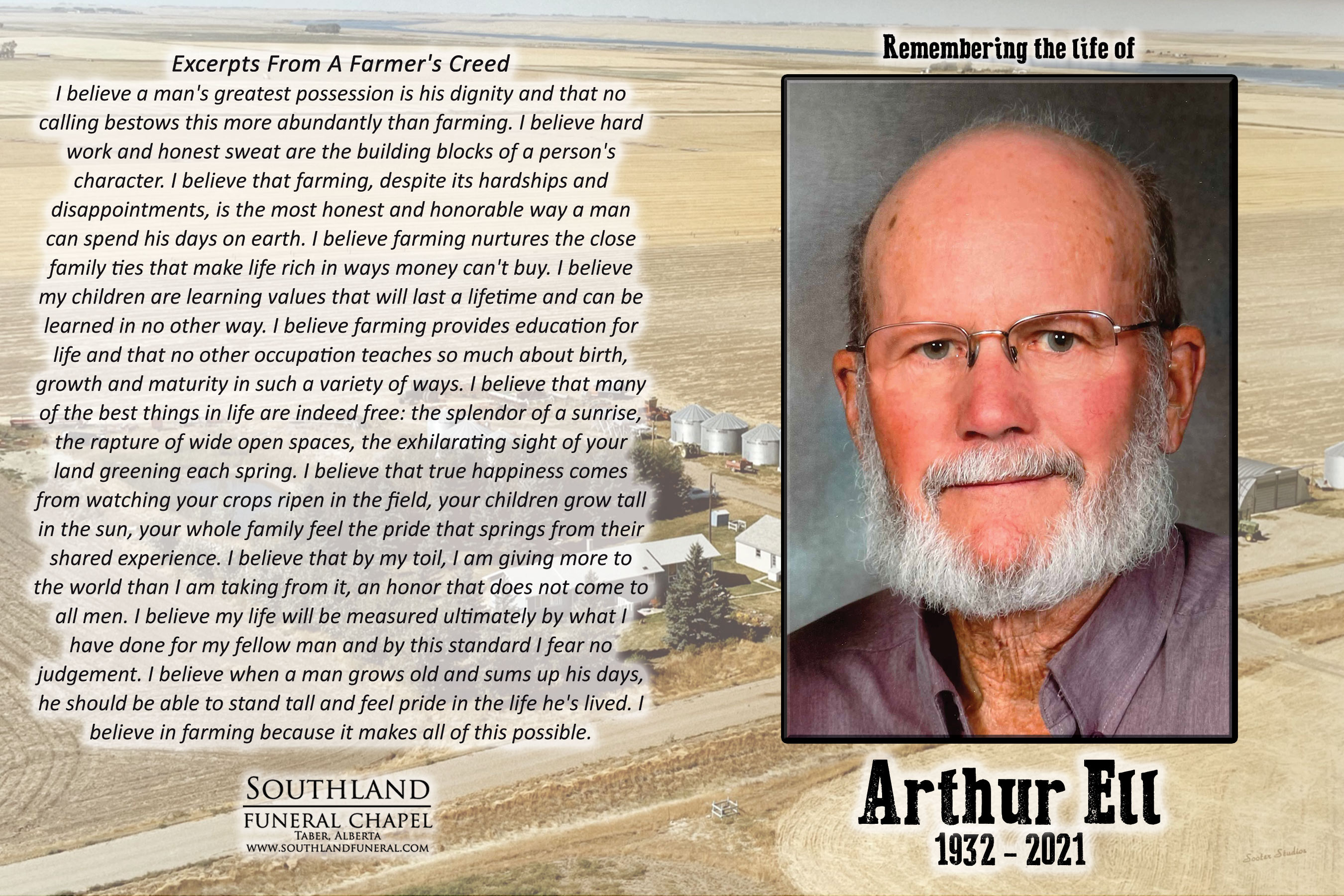 Arthur Andrew Ell, beloved husband of Arlene Ell, passed away in Taber on Wednesday, September 8, 2021 at the age of 89 years.