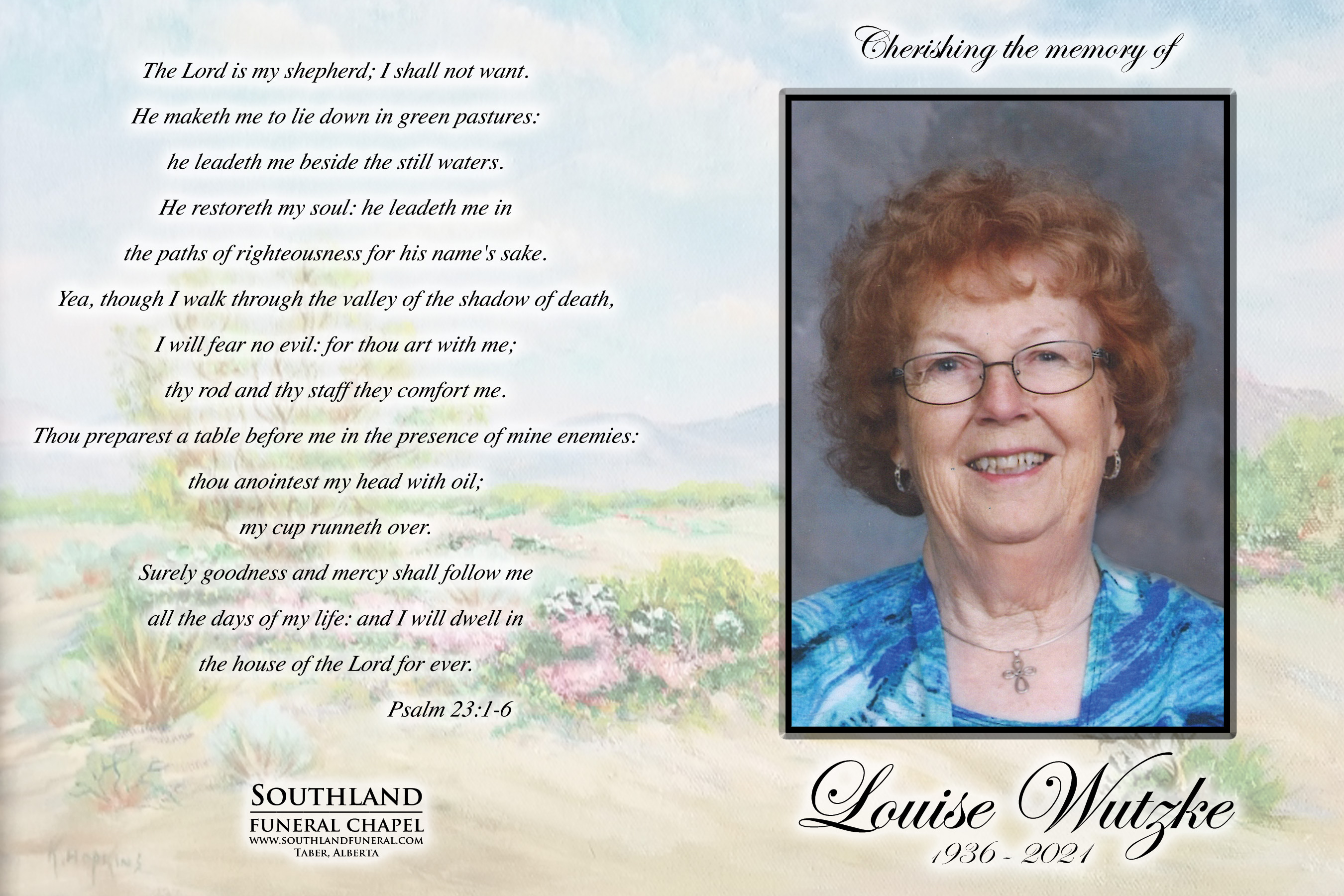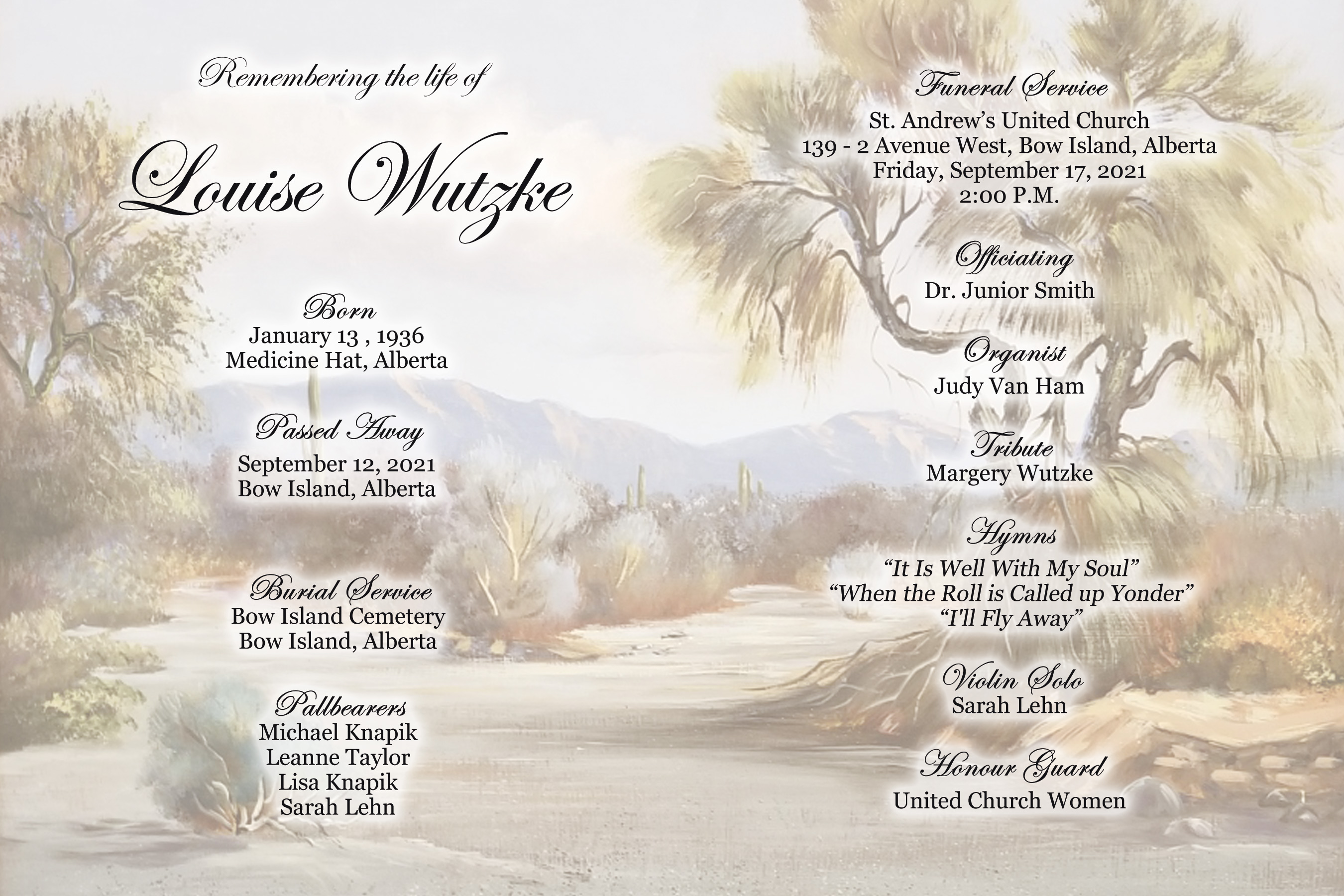 The Funeral Service was held at St. Andrew's United Church, 139 - 2 Avenue West, Bow Island on Friday, September 17, 2021 at 2:00 P.M. Burial followed at the Bow Island Cemetery.