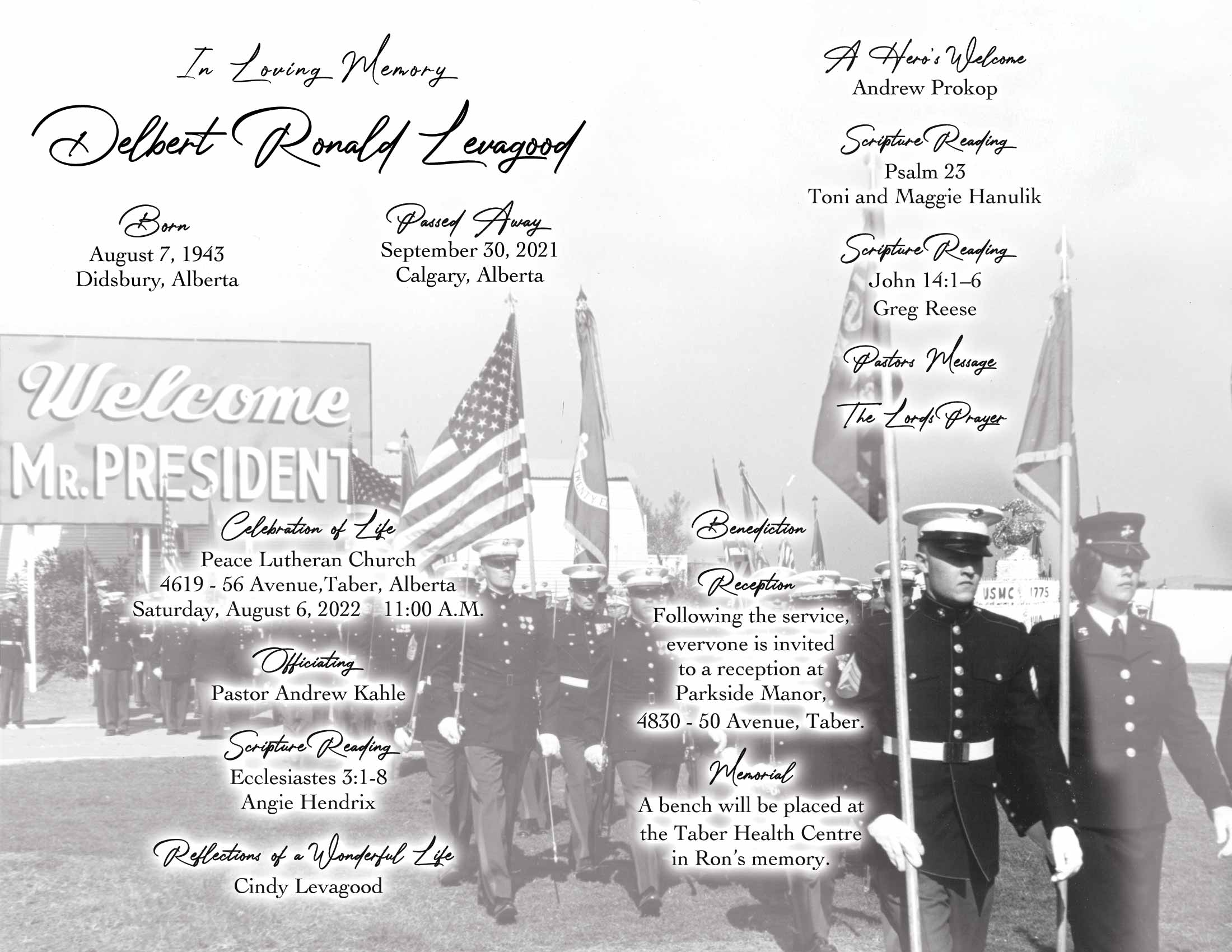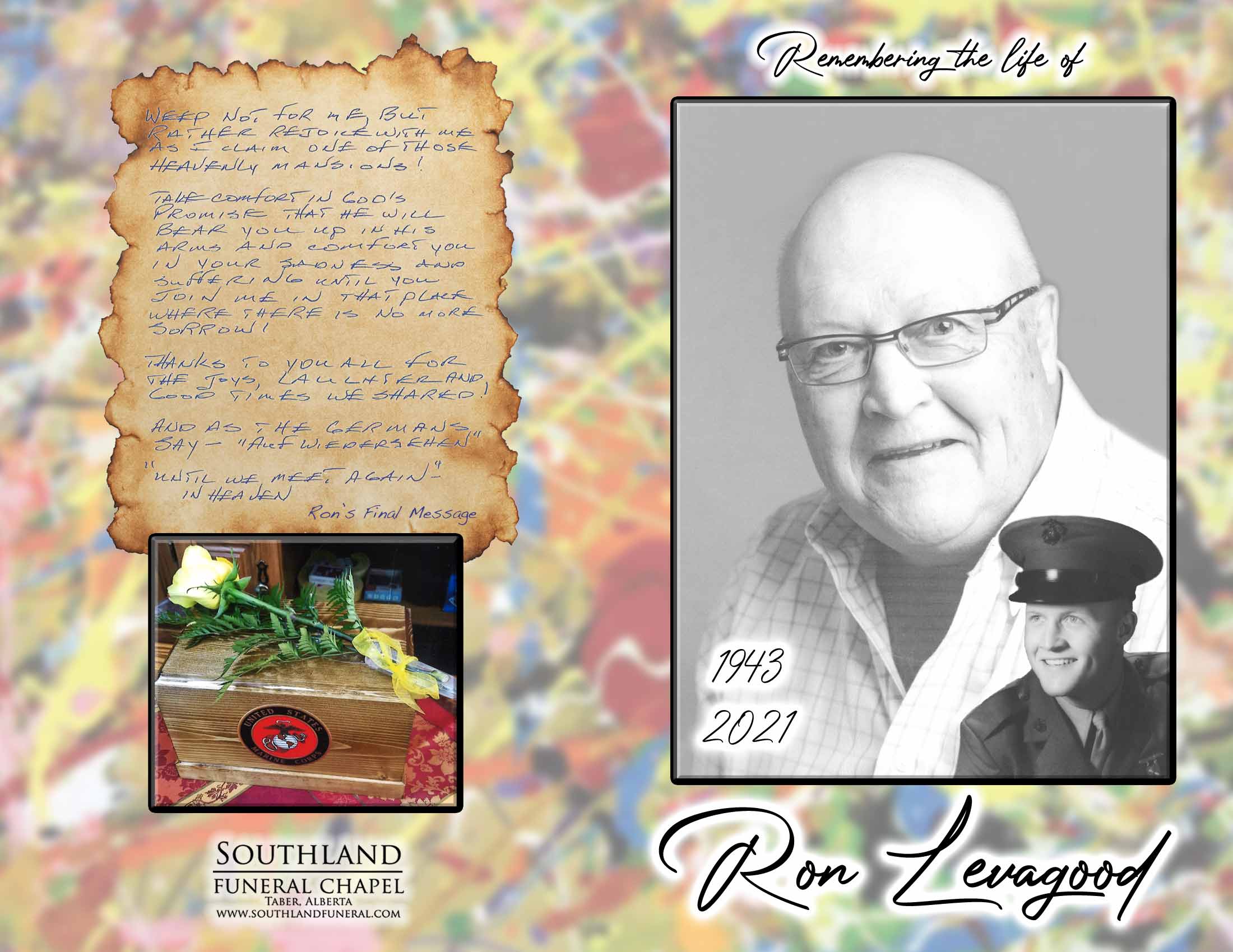 Ron was predeceased by his parents Delbert and Ella Levagood, brother Richard “Dick” Levagood, brother-in-law Steve Kiel and nephew Colin Reese.